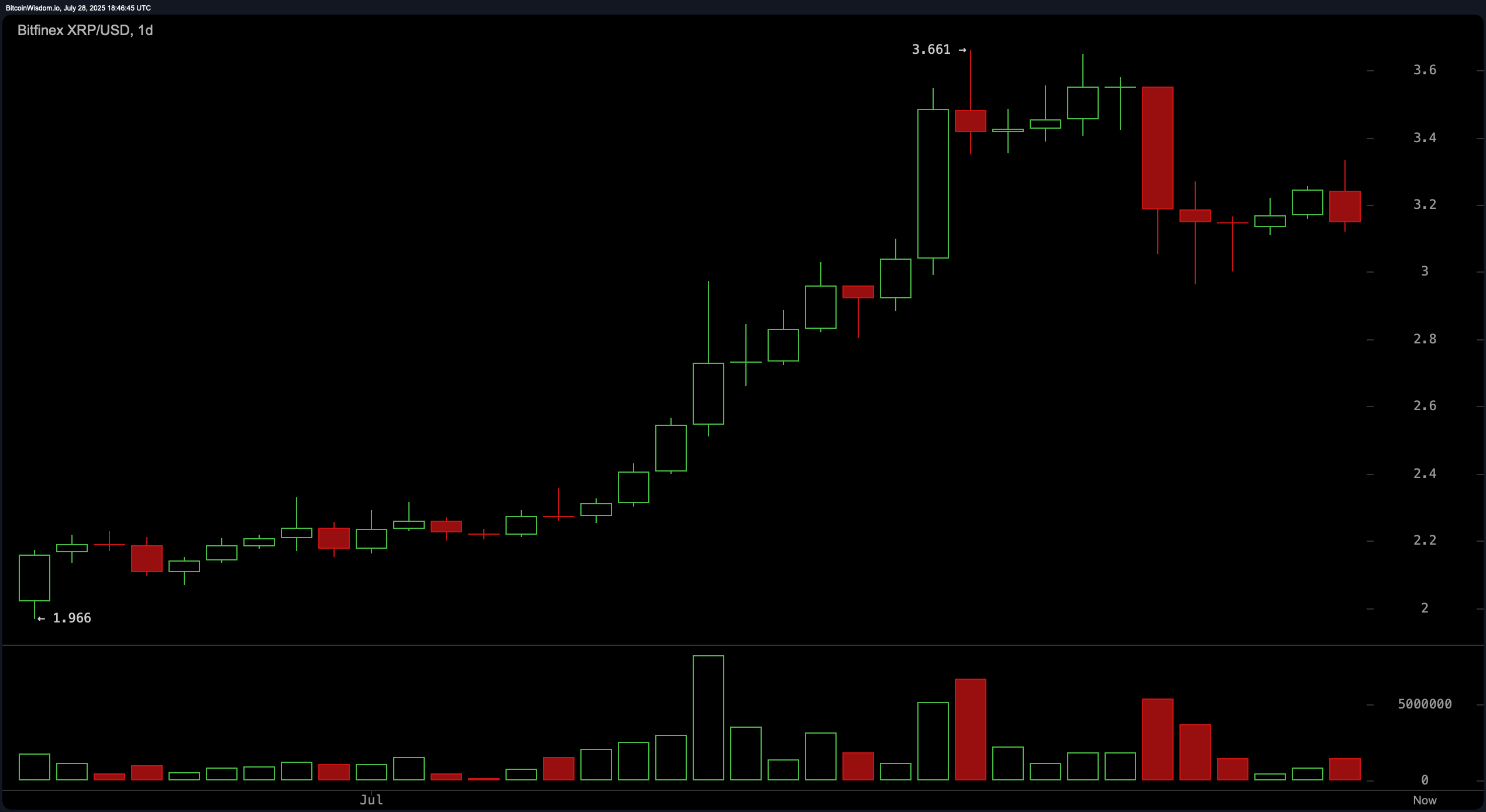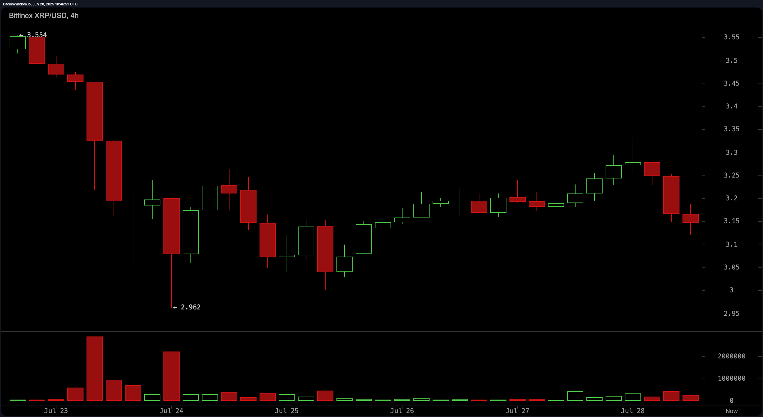 يظهر الرسم البياني اليومي اتجاهًا صعوديًا أوسع يمتد من حوالي $2.00 إلى قمة حديثة عند $3.661، على الرغم من أن ذلك تبعه تصحيح حاد. قد يشير الحجم المتزايد عند القمة إلى مرحلة توزيع، بينما يشير ظهور نمط الابتلاع الهبوطي والشموع الحمراء اللاحقة إلى ضغوط بيع مستمرة. حاليًا، يتماسك XRP ضمن النطاق $3.15–$3.30، محومًا فوق الدعم الرئيسي عند $3.00–$3.10. تقع مستويات المقاومة عند $3.50 و $3.66. يعد التأكيد الصعودي عبر اختراق فوق $3.35، مصحوبًا بحجم قوي، أمرًا ضروريًا لأي توقع متفائل. قد يؤدي الفشل في الحفاظ على $3.00 إلى سيناريو انهيار.