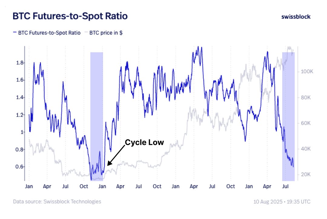 الأول هو نسبة العقود الآجلة إلى السوق الفوري، التي انخفضت إلى أدنى مستوى لها منذ أكتوبر ٢٠٢٢. لماذا هذا مهم؟