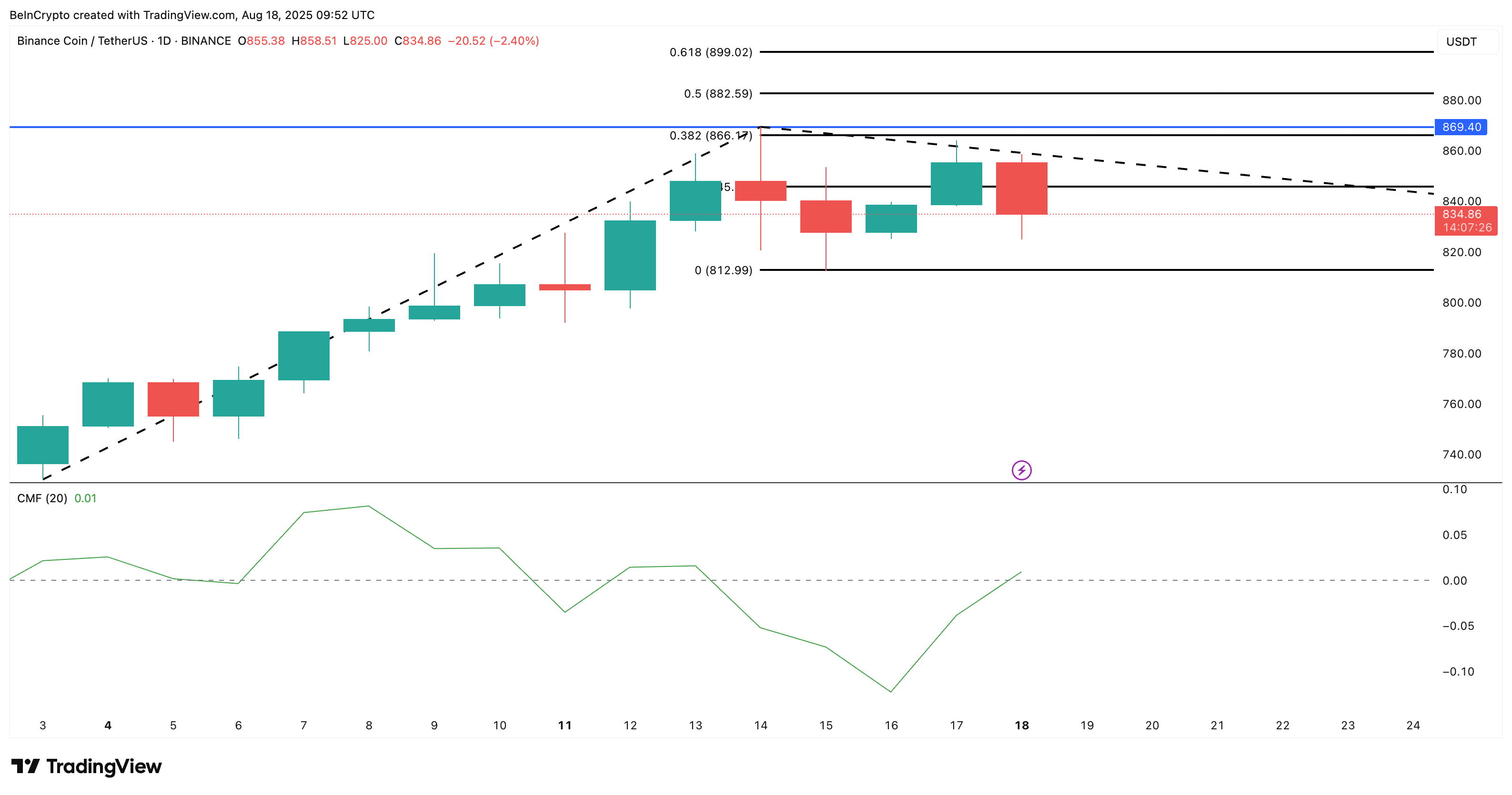 دفع الاتجاه الصعودي السابق لـ BNB السعر نحو ٨٦٦$. ومع ذلك، لم يتمكن من تجاوز ذلك، مما أدى إلى إنشاء قمم أقل. إذا تمكن سعر BNB من تجاوز ٨٦٦$، سيدخل مرة أخرى في وضع اكتشاف السعر. الهدف السعري التالي يقع بالقرب من ٨٨٢$.