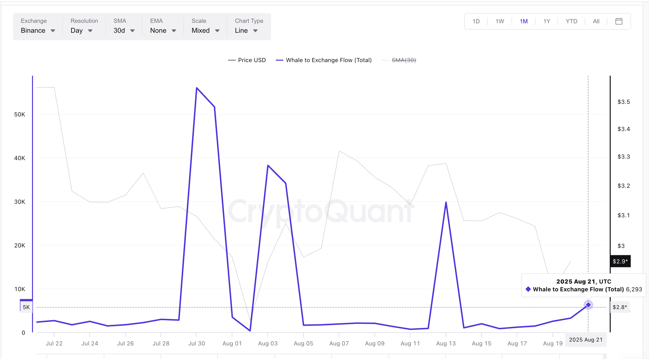 بدأت تدفقات الحيتان إلى بينانس في الارتفاع مرة أخرى بعد أن كانت منخفضة منذ 13 أغسطس. في ذلك التاريخ، بلغت التدفقات ذروتها عند حوالي 29,805 XRP، وانخفض سعر XRP من 3,27$ إلى 3,08$ بعد ذلك بوقت قصير.