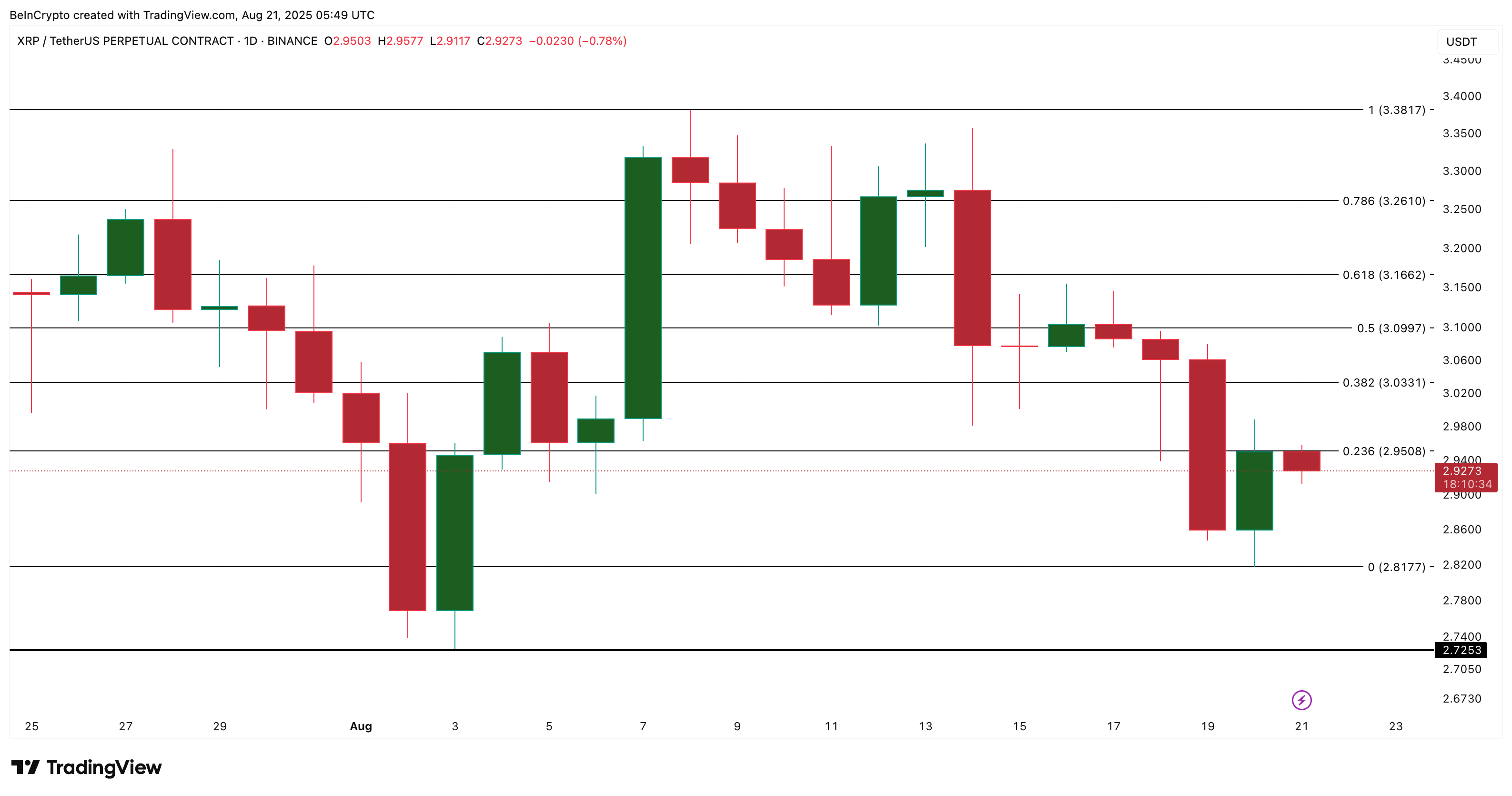 تظهر الرسم البياني اليومي أن XRP يواصل النضال بالقرب من مقاومة فيبوناتشي عند 2,95$. اختبر XRP هذا المستوى لفترة وجيزة مرة أخرى لكنه فشل في تحويله إلى دعم.
