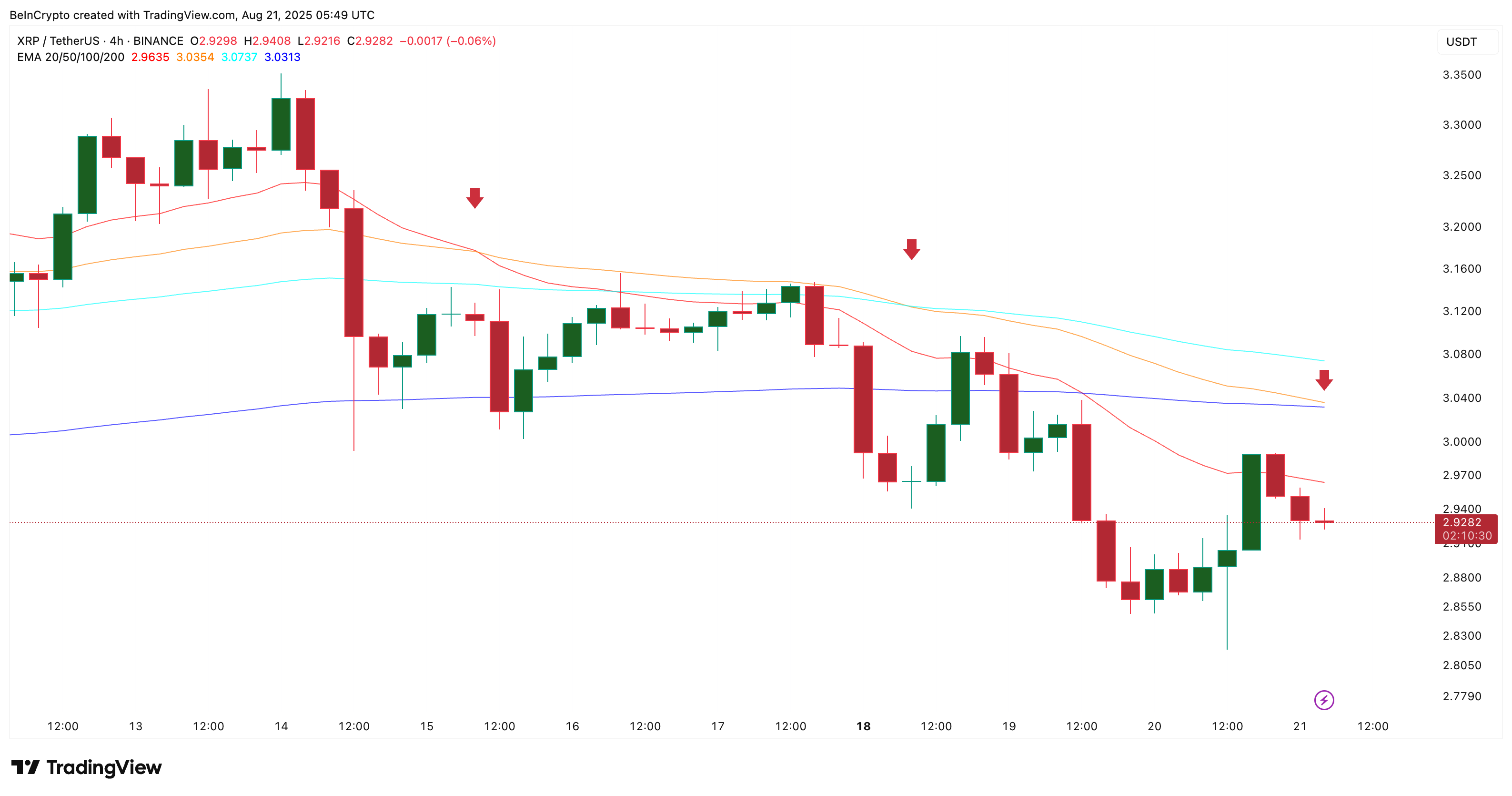 يظهر الرسم البياني لمدة 4 ساعات لسعر XRP أن الزخم الهبوطي يتزايد بسرعة. تم تحديد تقاطعين هبوطيين لـ EMA (المتوسط المتحرك الأسي) بالفعل على الرسم البياني (الأسهم الحمراء)، والآن يتشكل الثالث. يحدث تقاطع الموت لـ EMA عندما يتقاطع متوسط متحرك قصير الأجل مع متوسط طويل الأجل، وغالبًا ما يشير إلى تحول في اتجاه الاتجاه.