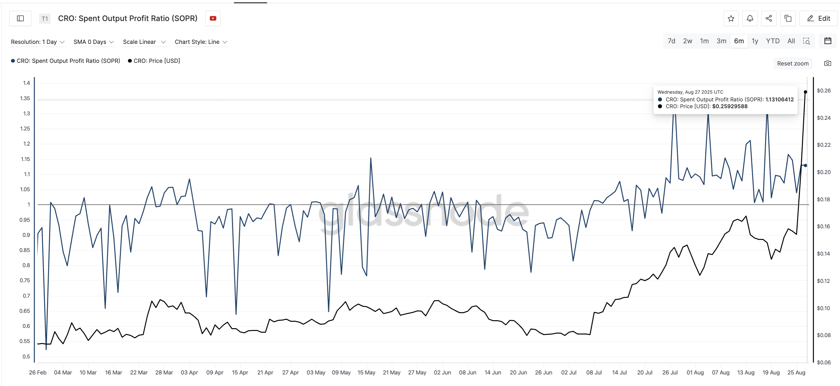 يصبح إشارة جني الأرباح أوضح عند النظر إلى نسبة الربح الناتج عن الإنفاق (SOPR) لكرونوس، والتي ارتفعت إلى 1,13 هذا الأسبوع — ثاني أعلى قراءة لها في ستة أشهر. تعني SOPR فوق 1 أن معظم العملات التي يتم نقلها تُباع بربح.