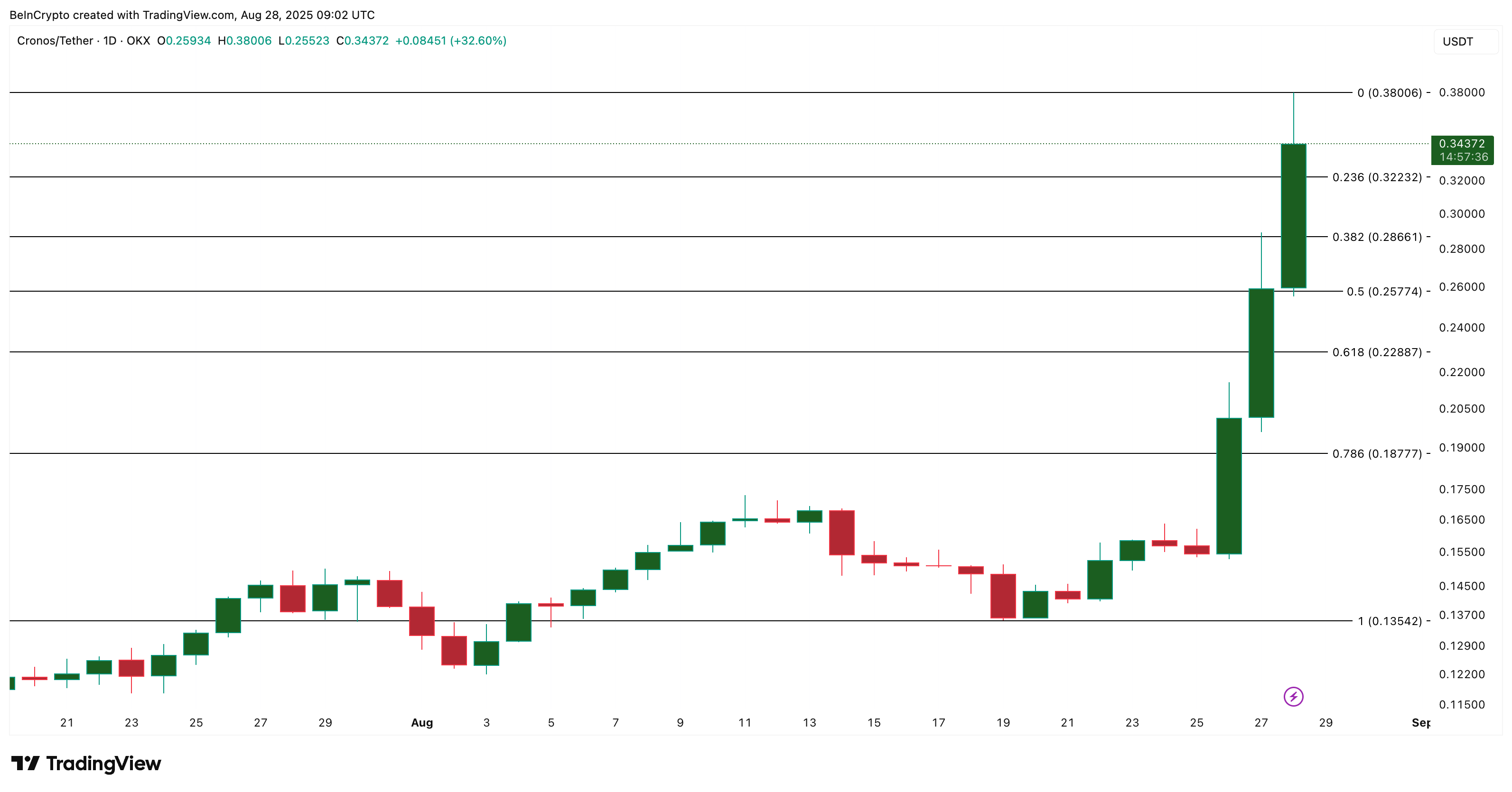 وسط هذه الإشارات التحذيرية، يظل الهيكل لسعر كرونوس (CRO) صعوديًا. لقد تجاوز الرمز المقاومات $0,28 و$0,32 وهو الآن يختبر $0,34. الهدف الفوري للصعود هو $0,38، والذي يجب على سعر كرونوس كسره بشكل مقنع لاستمرار الارتفاع.