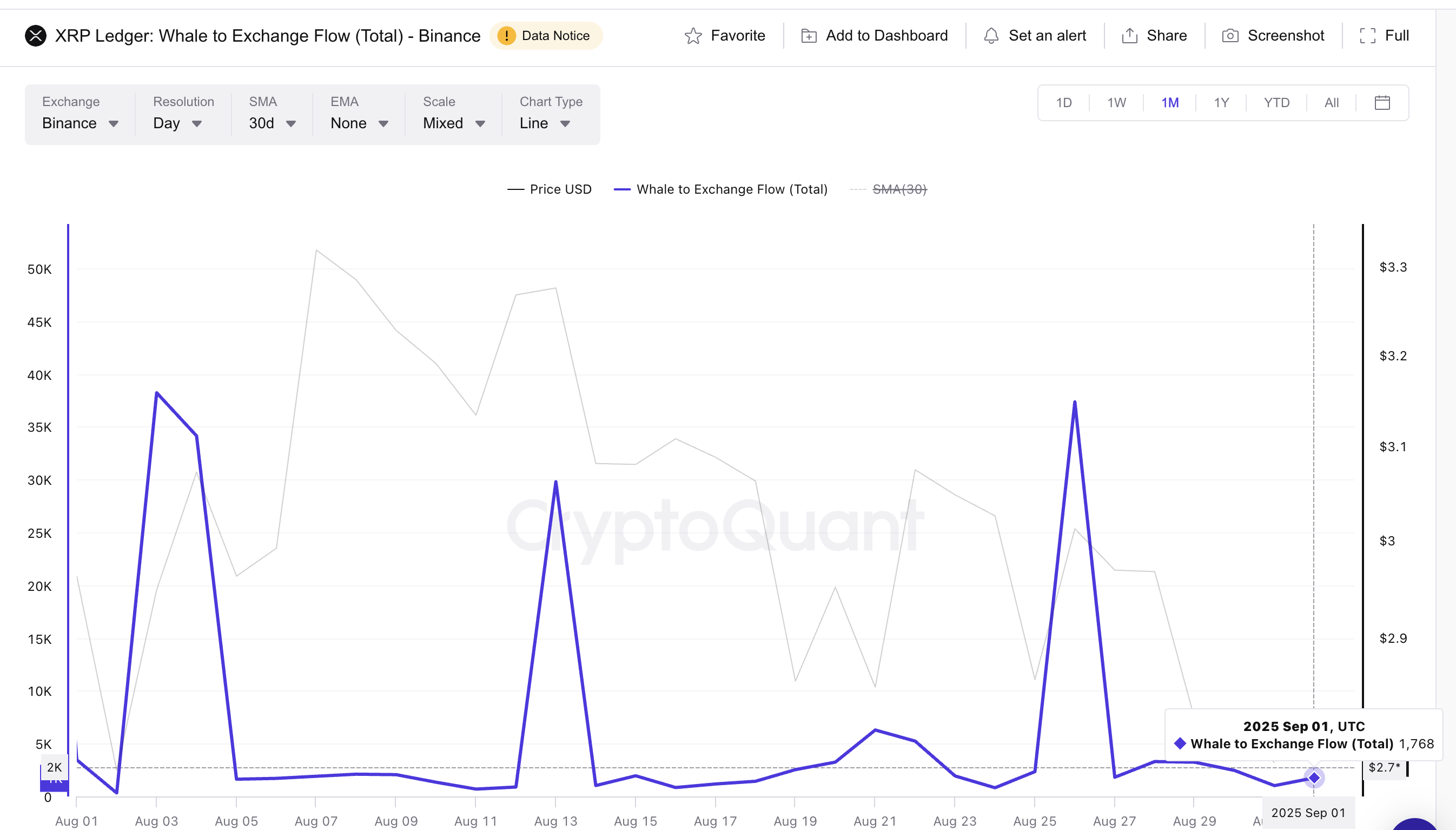 انخفضت تدفقات الحيتان إلى البورصات إلى 1,025 XRP في 31 أغسطس، وهو أحد أدنى المستويات في شهر. بحلول 1 سبتمبر، تعافت التدفقات قليلاً إلى 1,768 XRP، مما أبقى الضغط بالقرب من القيعان.