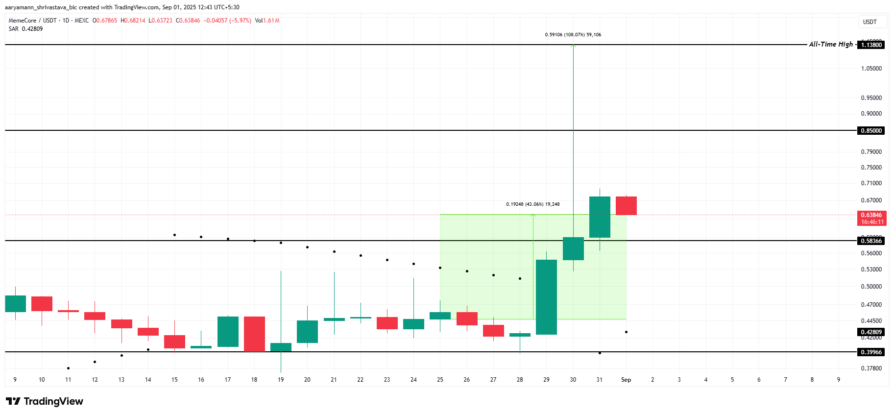 ارتفع سعر عملة M بنسبة 43% خلال الأربع والعشرين ساعة الماضية، حيث تم تداول عملة الميم عند 0.638 دولار أمريكي. وخلال هذا الارتفاع، حققت العملة البديلة مكاسب تجاوزت 108% إجمالا، مسجلة أعلى مستوى لها على الإطلاق. وقد لفت هذا الزخم القوي انتباها كبيرا، حيث عززت M مكاسبها بعد صعودها السريع.