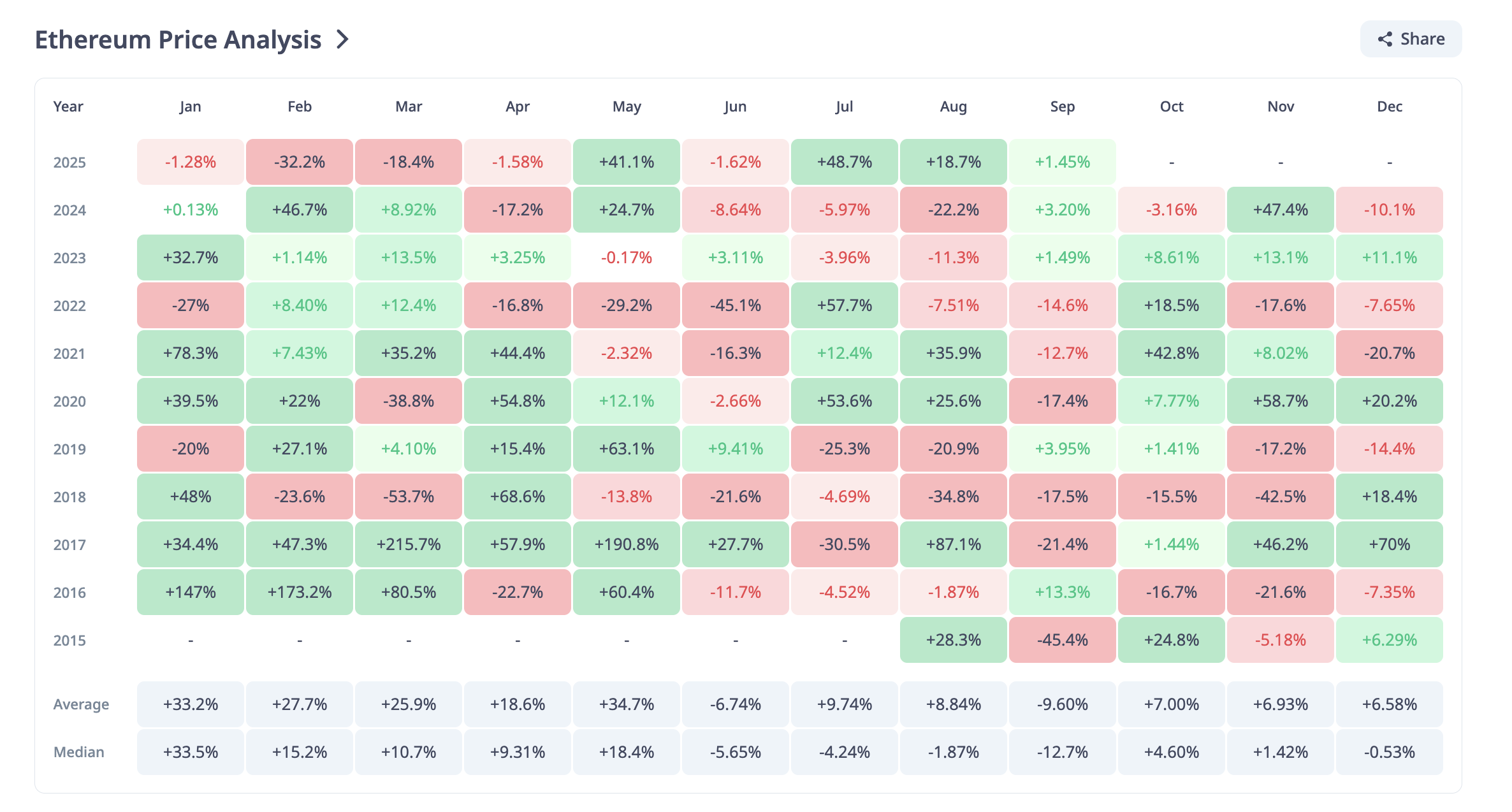 لأكثر من عقد من الزمان، كان سبتمبر أسوأ شهر للعملات الرقمية. سجلت بيتكوين عائدًا متوسطًا في سبتمبر بنسبة –3% منذ عام 2013، بينما كان عائد إيثريوم أضعف حتى بنسبة –12,7%. الانهيارات التاريخية — مثل انخفاض بيتكوين بنسبة –19% في عام 2014 أو انخفاض إيثريوم بنسبة –21% في عام 2017 — أدت إلى ظهور عبارة "كآبة سبتمبر للعملات الرقمية".