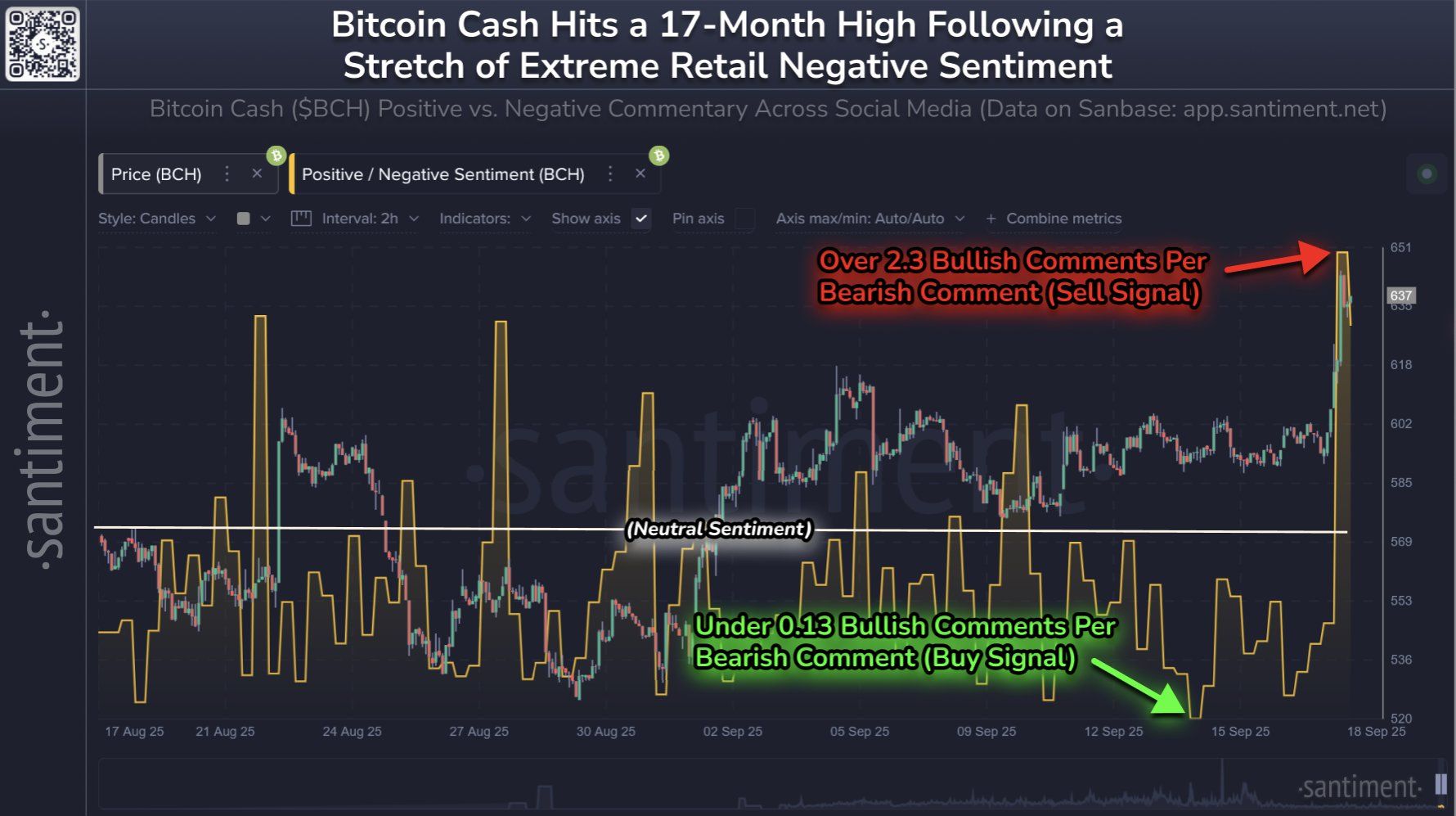يحذر Santiment من أن الأسعار غالبًا ما تتحرك في الاتجاه المعاكس لتوقعات الجمهور. خلال الارتفاع الأخير لبيتكوين كاش، كانت المعنويات سلبية للغاية، مما أدى إلى ارتداد قوي.