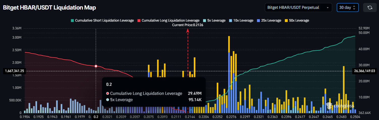 وفقًا لخريطة التصفية، قد يواجه HBAR ضغطًا كبيرًا إذا انخفض سعره إلى $0,200. عند هذا المستوى، تكون ما يقرب من $30 مليون من المراكز الطويلة عرضة للتصفية. مثل هذه الحركة ستزعزع بلا شك المتداولين الذين ظلوا متفائلين على الرغم من الانخفاض الأخير في السوق.