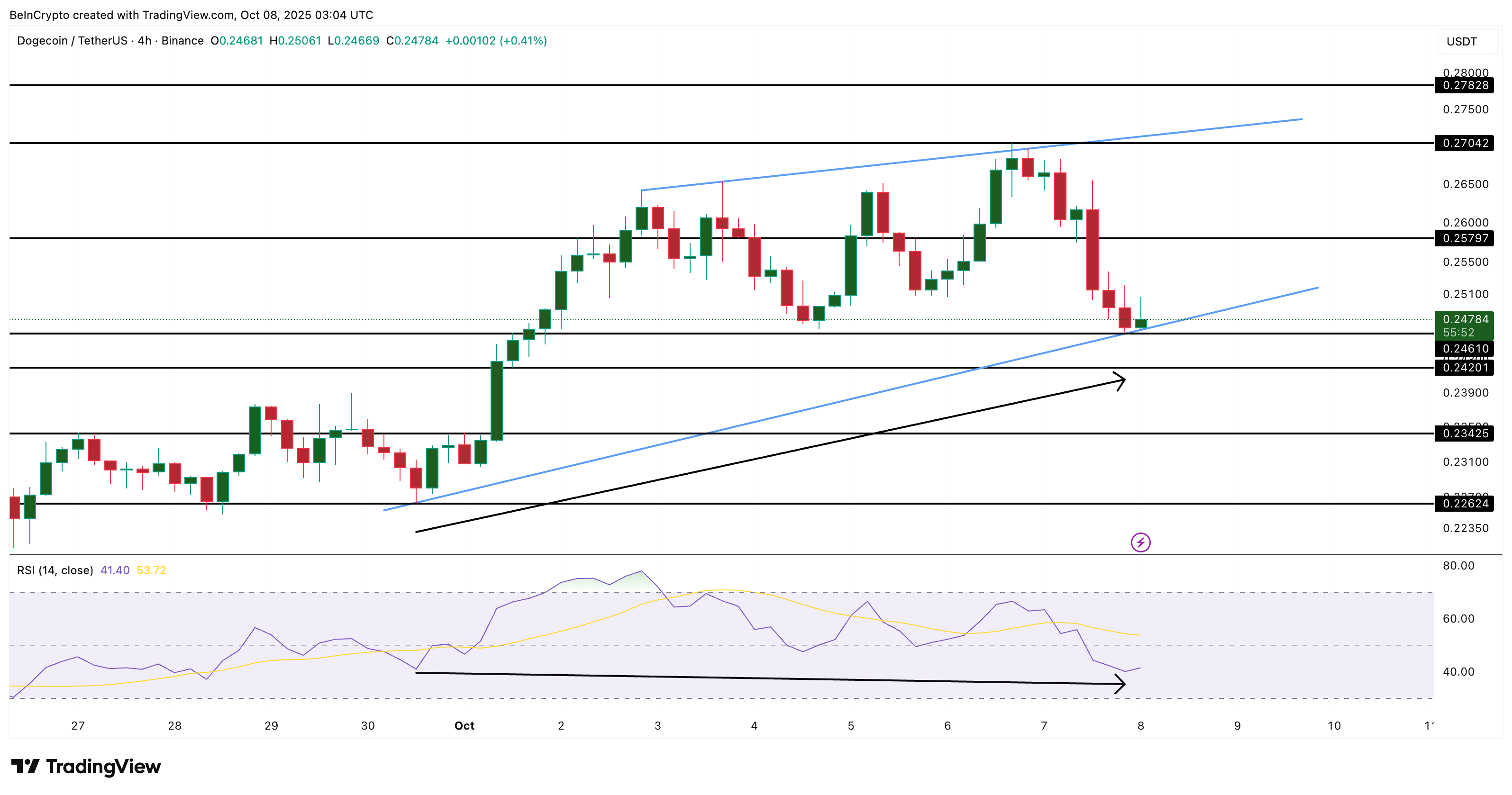 يظهر الرسم البياني لـ Dogecoin لمدة 4 ساعات السعر يحترم خط دعم صاعد داخل نمط إسفين صاعد. يشير الارتداد الأخير من $0,246 إلى أن المشترين يدافعون عن خط الاتجاه هذا.