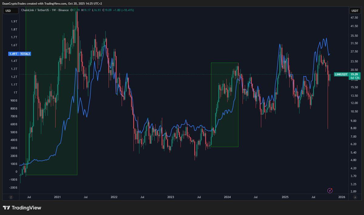 يشير العديد من المحللين الفنيين، مثل دان، إلى أن Chainlink قد تفوقت تاريخيًا على مؤشر العملات البديلة (TOTAL2) خلال التجمعات القوية في السوق منذ عام 2021. في كل مرة يظهر نمط تراكم مشابه، تكون LINK غالبًا من بين أولى الرموز التي تقود الموجة التالية. مايكل فان دي بوب، الذي يشارك نفس الرأي، أشار إلى أن هيكل سعر LINK/BTC يظهر علامات على اختراق كبير قادم.