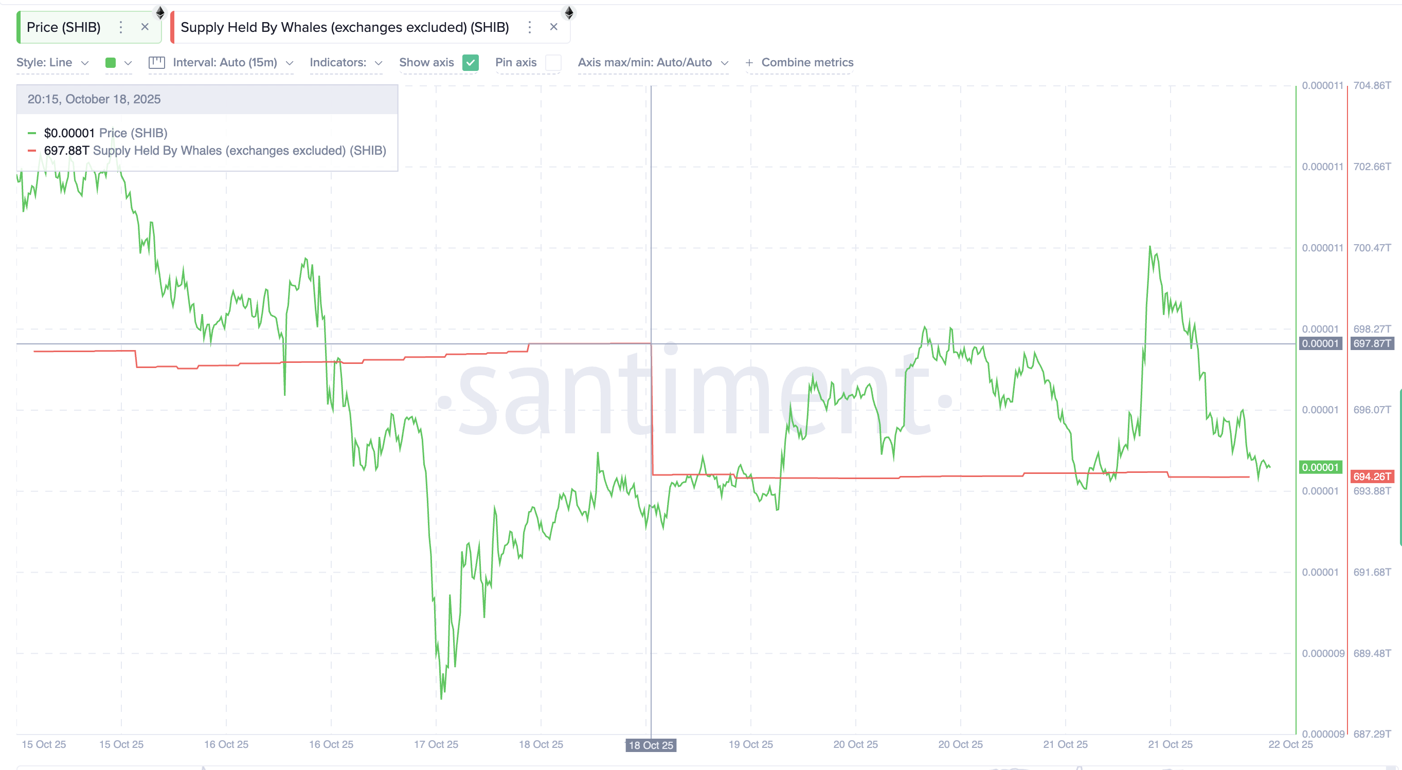 تظهر البيانات أن المحافظ التي تحتفظ بكميات كبيرة من هذه العملة الميمية خفضت مجموع مخزونها من 697,88 تريليون إلى 694,26 تريليون، بتخفيض قدره حوالي 3,62 تريليون SHIB، بقيمة حوالي 355,000 دولار بالسعر الحالي البالغ 0,0000098 دولار.