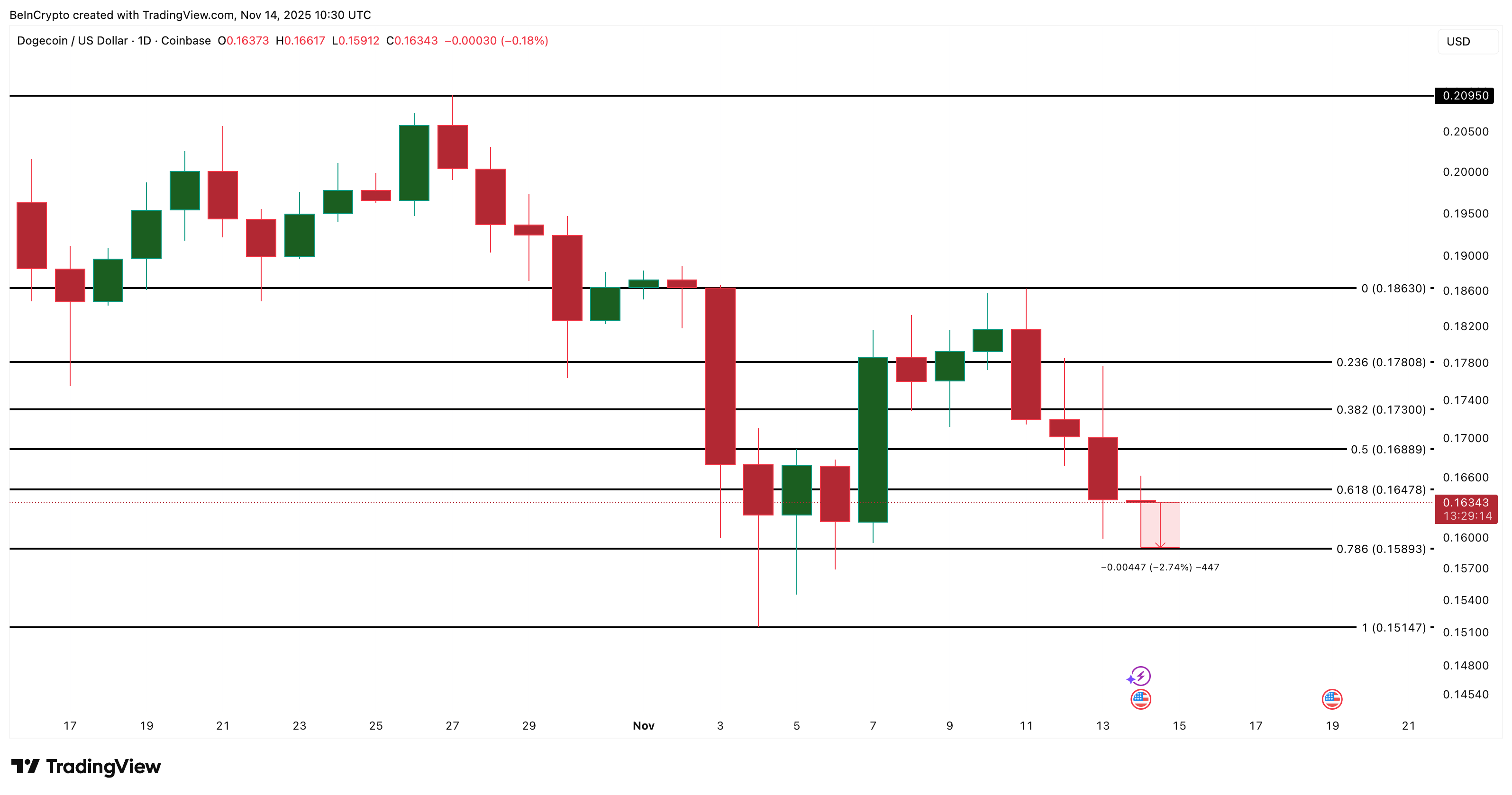 إذا أغلق الدوجكوين شمعة يومية تحت $0,164 (وهو ممكن حاليًا), فإنه سيتزلج تحت هذه المجموعة. مع عدم وجود مستويات دعم ثقيلة تحتها, يمكن للسعر الانخفاض بسرعة. المستوى الرئيسي التالي هو $0,158, أقل بنسبة 2,6% فقط. أي انهيار هناك يكشف عن $0,151 وخسائر أعمق إذا ظل السوق ضعيفًا.