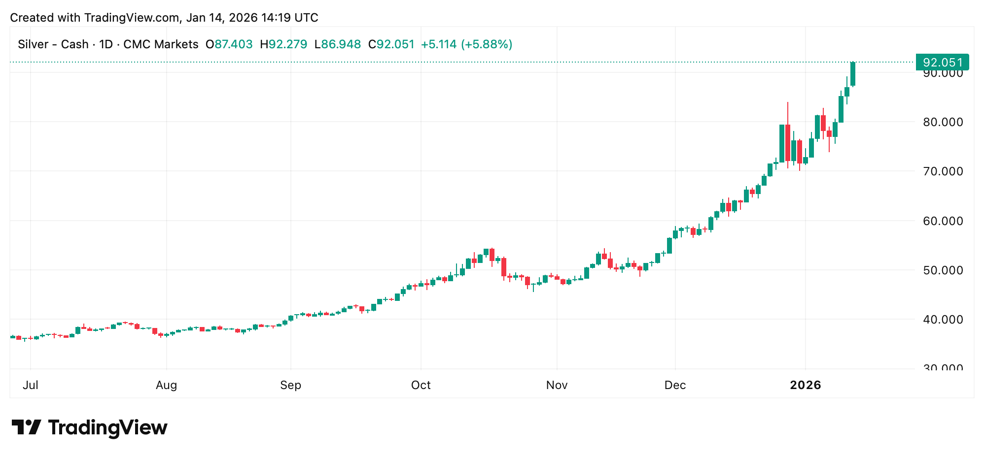 كما أن الفضة قد جلبت طلبًا شديدة، مما دفع سعرها بالقرب من عتبة 100 دولار. يتم الإبلاغ عن نقص في جميع أنحاء العالم، تشمل الصين، الولايات المتحدة، الهند، اليابان، الشرق الأوسط، وأوروبا. تراكمت طلبات التسليم المادية الثقيلة، مما رفع العلاوة المادية. وقد تأخرت Mint الأمريكية في إصدار منتجات معينة، وخاصة النقود التذكارية.