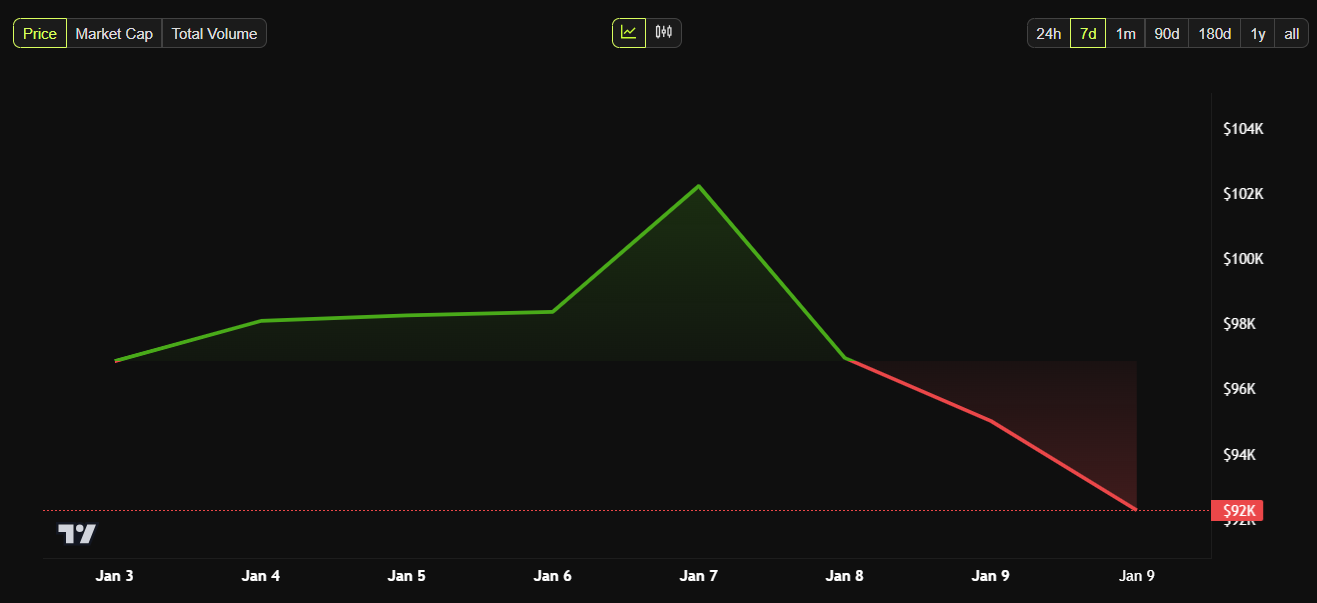 كان بيتكوين يتداول عند 93,360 دولار وقت النشر، بانخفاض 2,1% خلال الـ24 ساعة الماضية. الانخفاض مقلق حيث تجاوز بيتكوين 100,000 دولار مرة أخرى قبل يومين فقط.