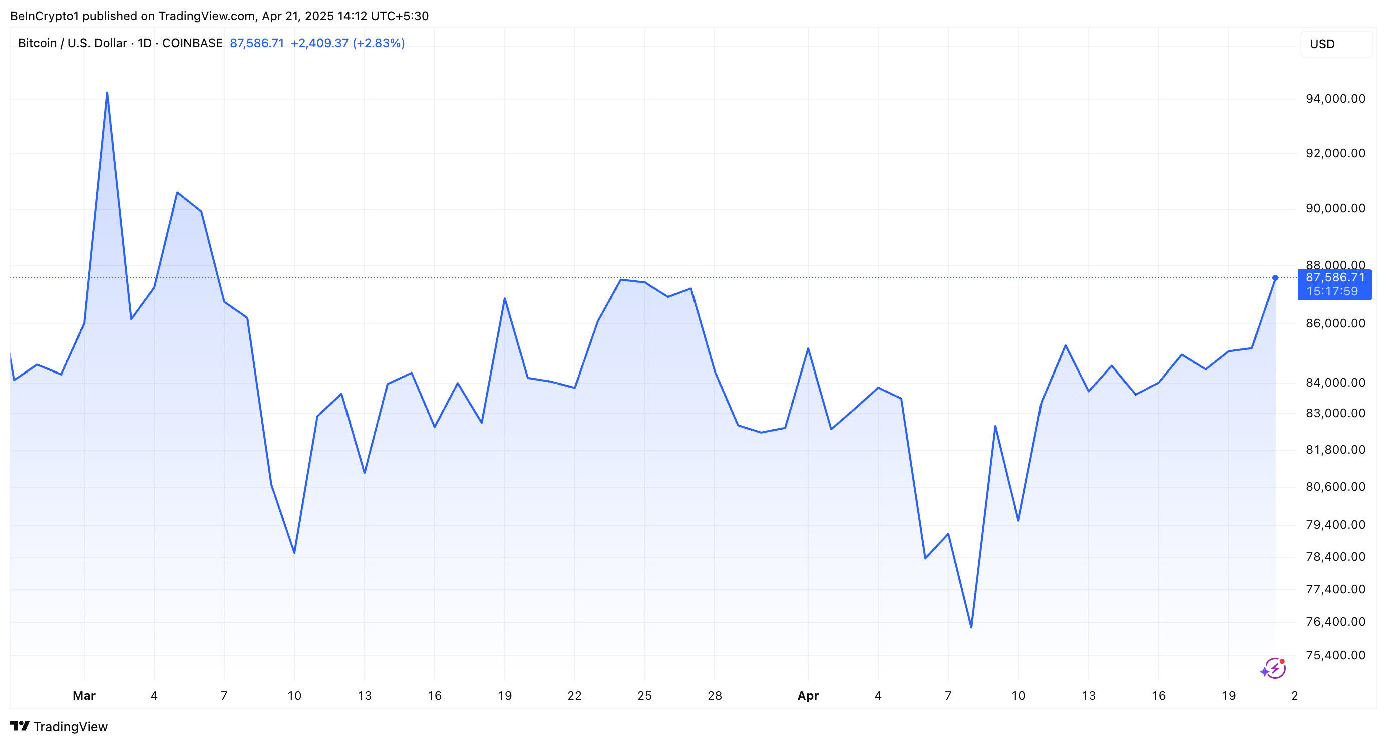 في الواقع، تزامن الانخفاض الأخير في مؤشر الدولار مع زيادة ملحوظة في سعر بيتكوين. ارتفعت أكبر عملة رقمية إلى أكثر من 87,000 دولار لأول مرة منذ 2 أبريل.