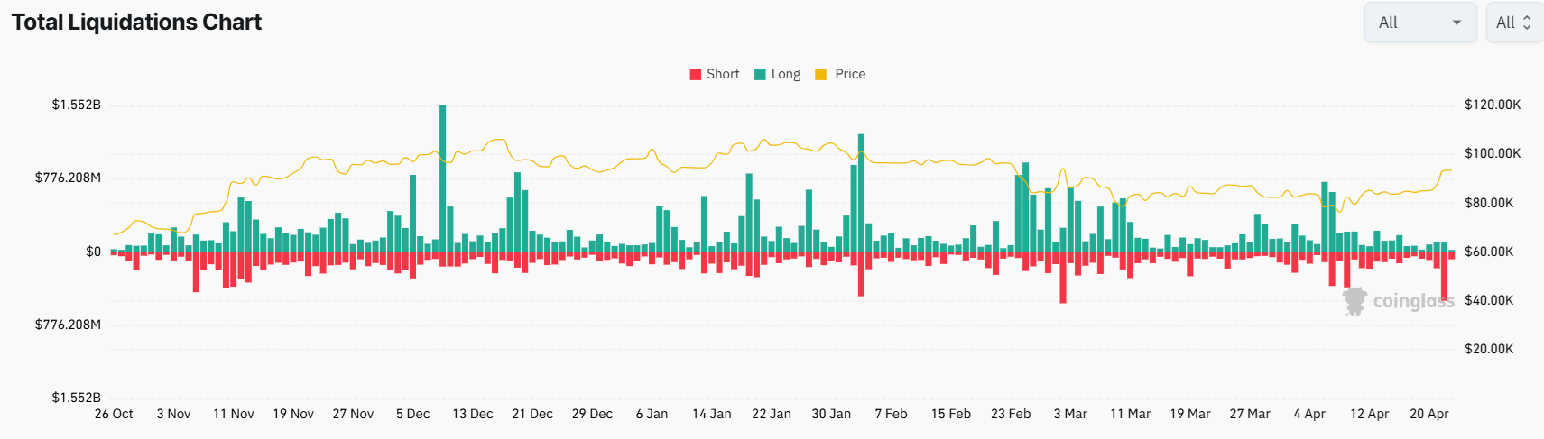 في 22 أبريل ، بلغت تصفيات BTC القصيرة أكثر من 517 مليون دولار ، في النطاق الأعلى خلال الأشهر القليلة الماضية.