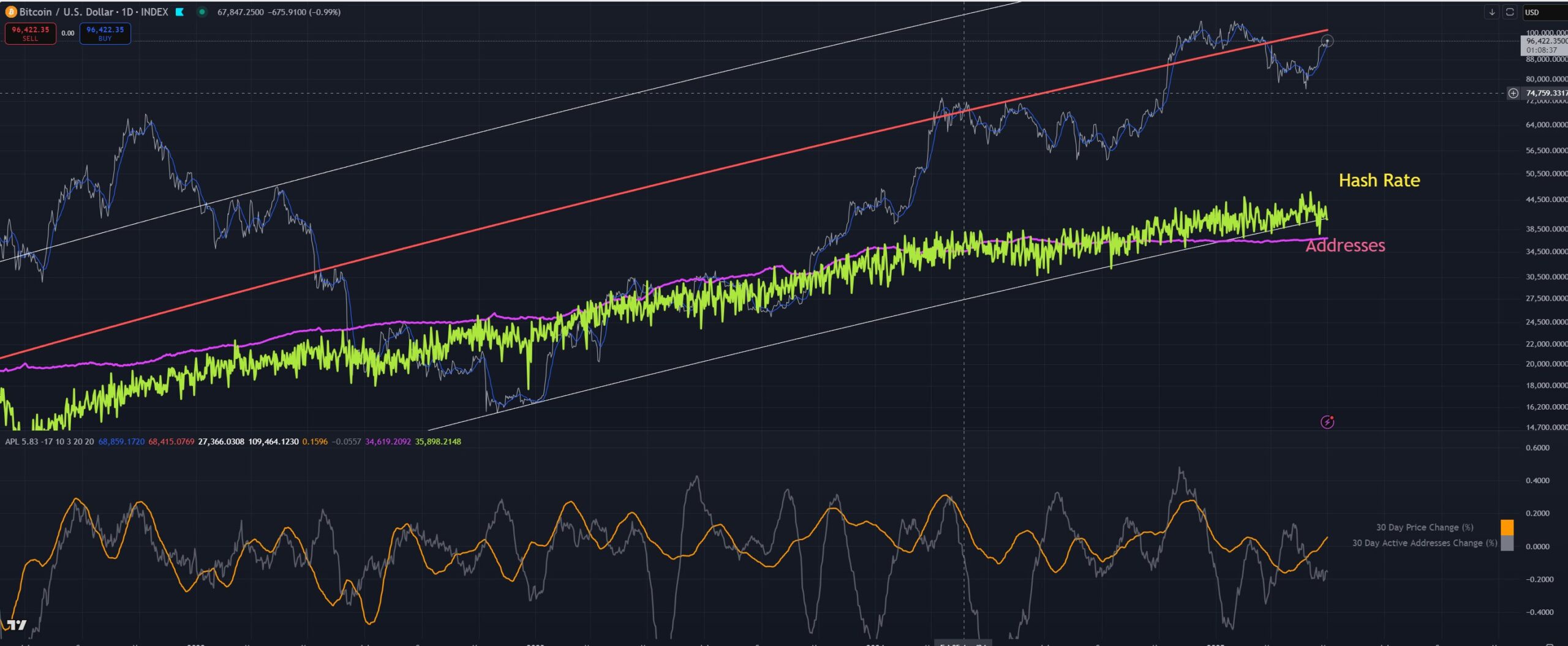 نموذج سعر معدل الهاش لبيتكوين، الذي يقيم قيمة بيتكوين بناءً على العلاقة التاريخية بين سعرها ومعدل الهاش، يضيف إلى النظرة الصعودية.