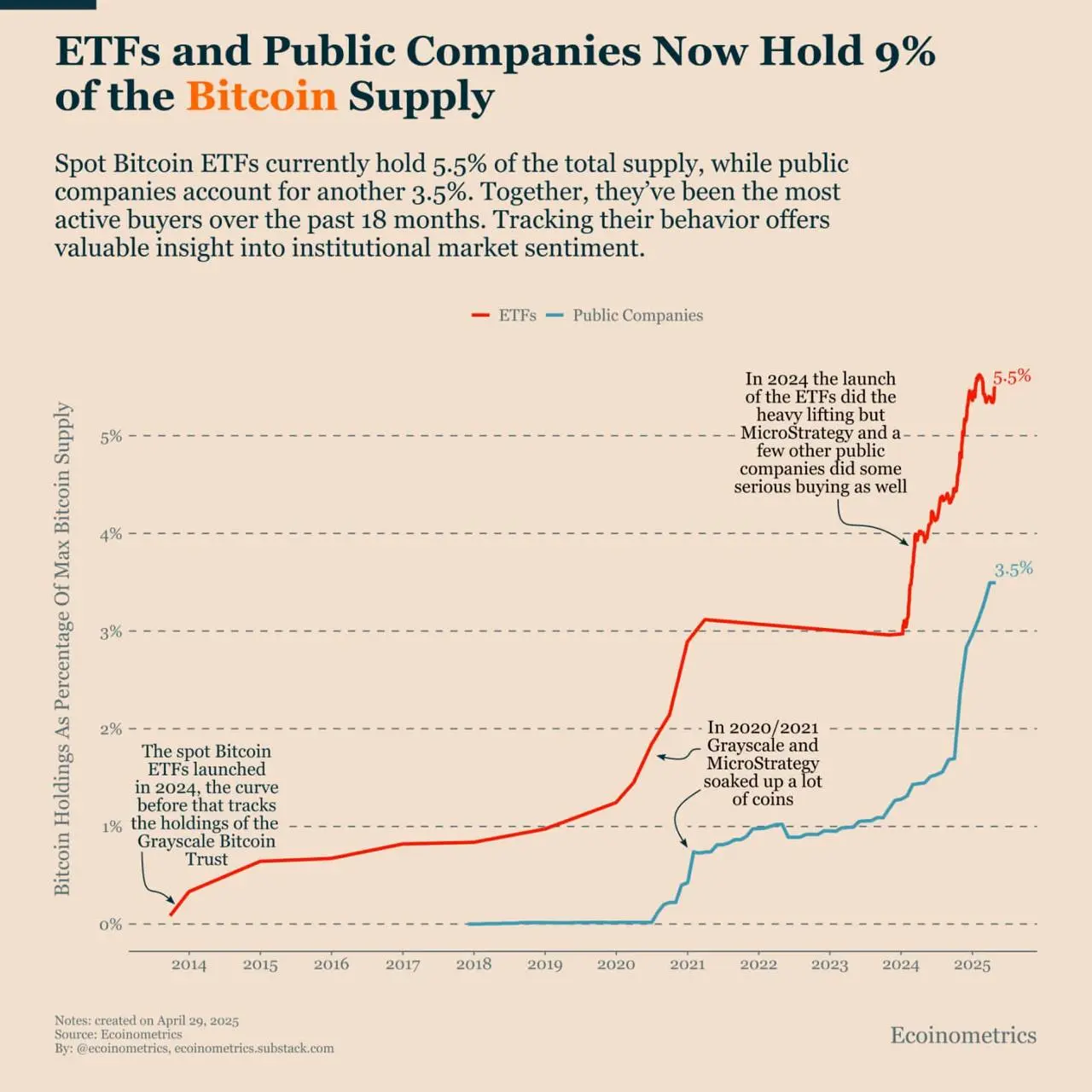 9 ٪ من عرض BTC الذي تحتفظ به الشركات العامة وصناديق الاستثمار المتداولة