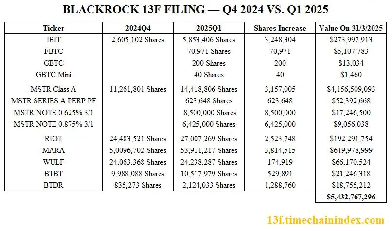 وفقًا للإيداع ، نما موقع BlackRock في IBIT بنسبة 124.7 ٪ بين الربع الرابع من 2024 و Q1 لعام 2025 ، حيث اشترى 3،248304 سهم إضافي من IBIT. هذا زاد من إجمالي مقتنياتها إلى أكثر من 5.8 مليون سهم بقيمة 273.99 مليون دولار.