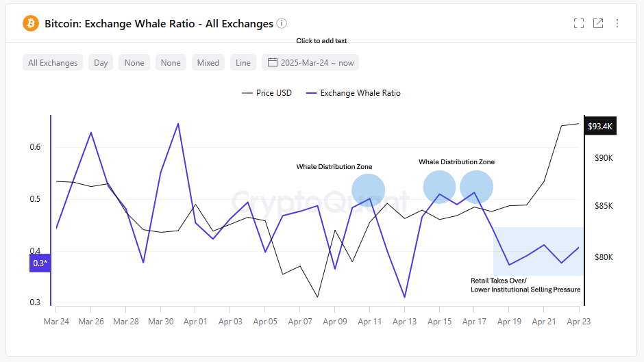 تشير نسبة الحيتان في البورصات، التي انخفضت إلى أقل من 0,3 في 23 أبريل، إلى تحول كبير في المشاركة، من المؤسسات أو المتداولين الكبار إلى تدفقات أكثر هيمنة من التجزئة.