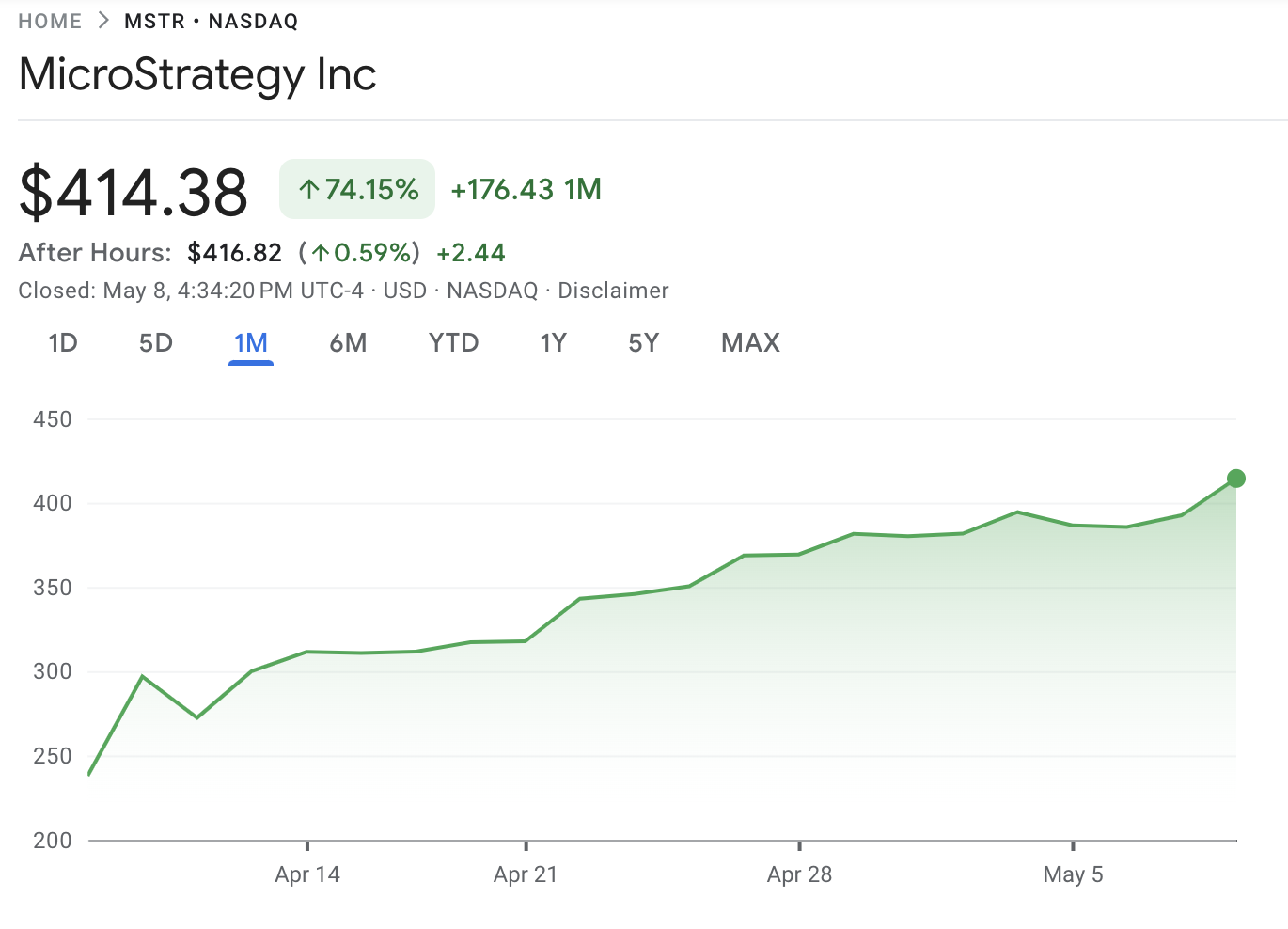 سهم ستراتيجي ارتفع جنبًا إلى جنب مع مكاسب بيتكوين مؤخرًا. ارتفع MSTR بنسبة 7% اليوم و75% في الشهر الماضي على الرغم من الخسائر الكبيرة في أوائل مارس وQ1.