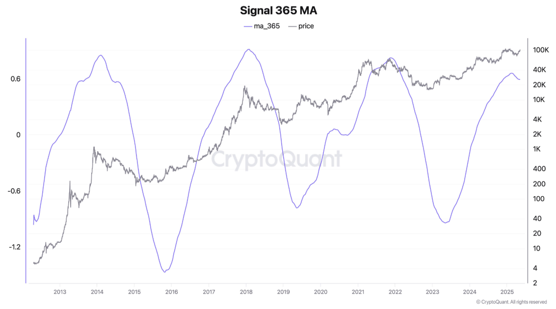 ومع ذلك، يصر جو على أن البيانات على السلسلة تحتفظ بقيمة تحليلية. ويشير إلى مخطط Signal 365 MA كمقياس طويل الأجل. يتتبع هذا المقياس انحراف سعر بيتكوين عن متوسطه المتحرك لمدة 365 يومًا.