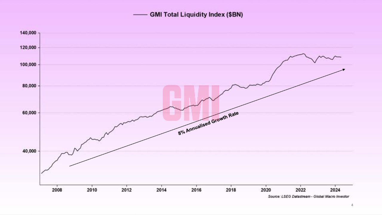 ينمو مؤشر السيولة العالمي حاليًا بنسبة 8% سنويًا. لفهم السيولة، اقترح بول أنه يجب علينا أولاً فهم الناتج المحلي الإجمالي. قدم صيغة لنمو الناتج المحلي الإجمالي: نمو الناتج المحلي الإجمالي = نمو السكان + نمو الإنتاجية + نمو الدين.