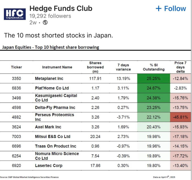 ميتابلانيت، الشركة المدرجة في طوكيو التي ارتفعت بنسبة ٥٬٠٠٠٪ في عام ٢٠٢٤ بعد استراتيجيتها الجريئة في خزينة بيتكوين، هي الآن السهم الأكثر تعرضًا للبيع على المكشوف في اليابان، وفقًا لمديرها التنفيذي.