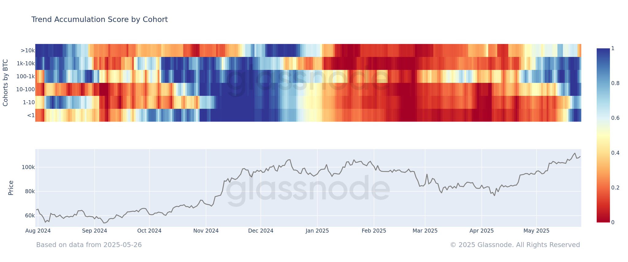 تؤكد بيانات Glassnode هذا الاتجاه. في مايو، انخفضت درجة التراكم للمحافظ التي تحتوي على أكثر من ١٠٬٠٠٠ BTC من حوالي ٠,٨ إلى أقل من ٠,٥. يتم تمثيل هذا التحول بصريًا بتغير اللون من الأزرق إلى البرتقالي.