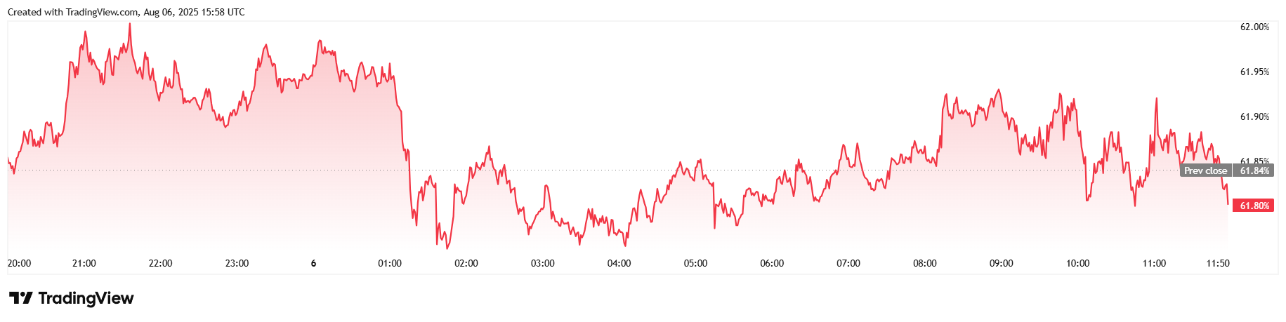 انخفض حجم التداول لليوم بنسبة 6.77% إلى $56.38 مليار لكن القيمة السوقية ارتفعت بنسبة 2.25% إلى $2.29 تريليون. كانت هيمنة البيتكوين مستقرًة إلى حد كبير خلال 24 ساعة وبلغت 61.80%.