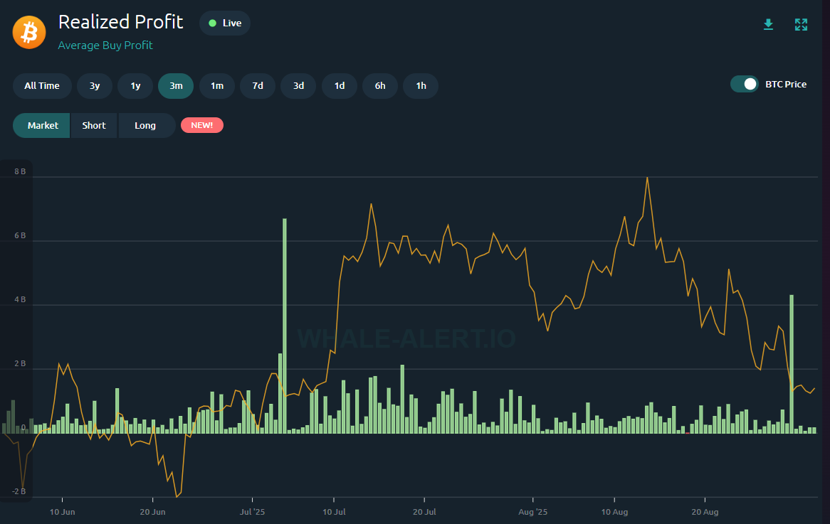 بشكل عام، لا تزال الحيتان تحافظ على اتجاه التراكم الصافي. مع ذلك، لا يزال البيع قصير الأجل، وخاصةً من المحافظ القديمة والمُراقبة عن كثب، قادرًا على هزّ السوق. حققت الحيتان أرباحًا في نهاية أغسطس، وظلت تبيع عند مستوى أساسي أعلى خلال الأشهر القليلة الماضية.