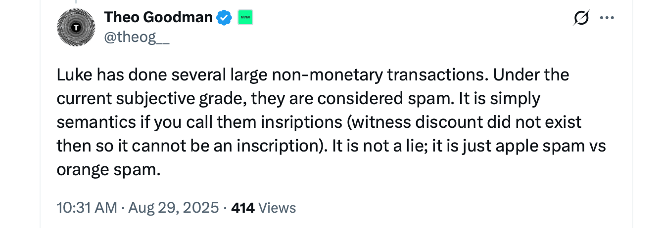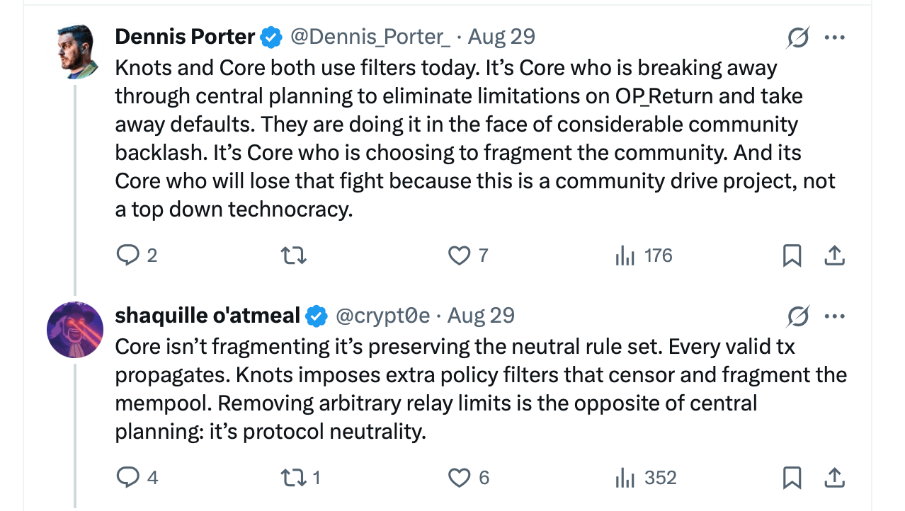 عبر 174 منشوراً فريداً على X من 27 أغسطس إلى 3 سبتمبر، قام داعمو بيتكوين بتأطير النزاع حول المبادئ الأساسية: هل بيتكوين هو شبكة نقدية بالدرجة الأولى تتطلب الحياد فيها توجيه جميع المعاملات الصالحة، أم يجب على مشغلي العقد تفضيل البرامج التي تصفي أنماط معينة في طبقات الذاكرة المؤقتة والتوجيه لتثبيط أحجام البيانات الكبيرة غير النقدية؟