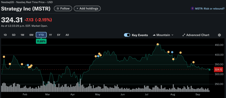 بعد عملية الشراء اليوم، انخفض سهم Strategy (MSTR) بنسبة 2.15%، ليتداول عند 324.31 دولاراً أمريكياً وقت كتابة هذا التقرير.