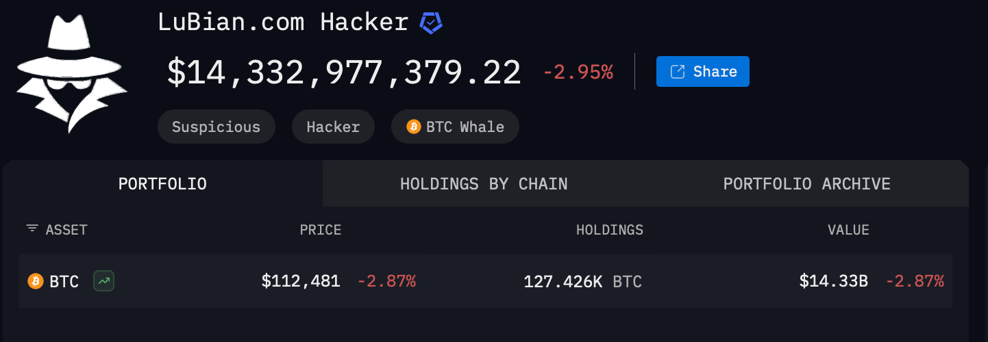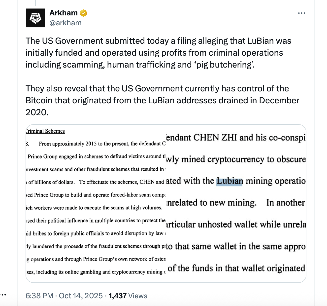 تسرد صفحة الكيان العام لـ Arkham ” مخترق Lubian” وتتعقب حوالي 127,426 BTC تنسب إلى استغلال Lubian.com، وهو تجمّع تعدين مرتبط بالصين، مع التحويلات التي تعود إلى أواخر عام 2020. نشرت Arkham لأول مرة تحقيقها في أغسطس، واصفةً إياه بأنه سرقة مرت دون أن تُكتشف لسنوات ويقدر الآن بمليارات الدولارات بأسعار اليوم.