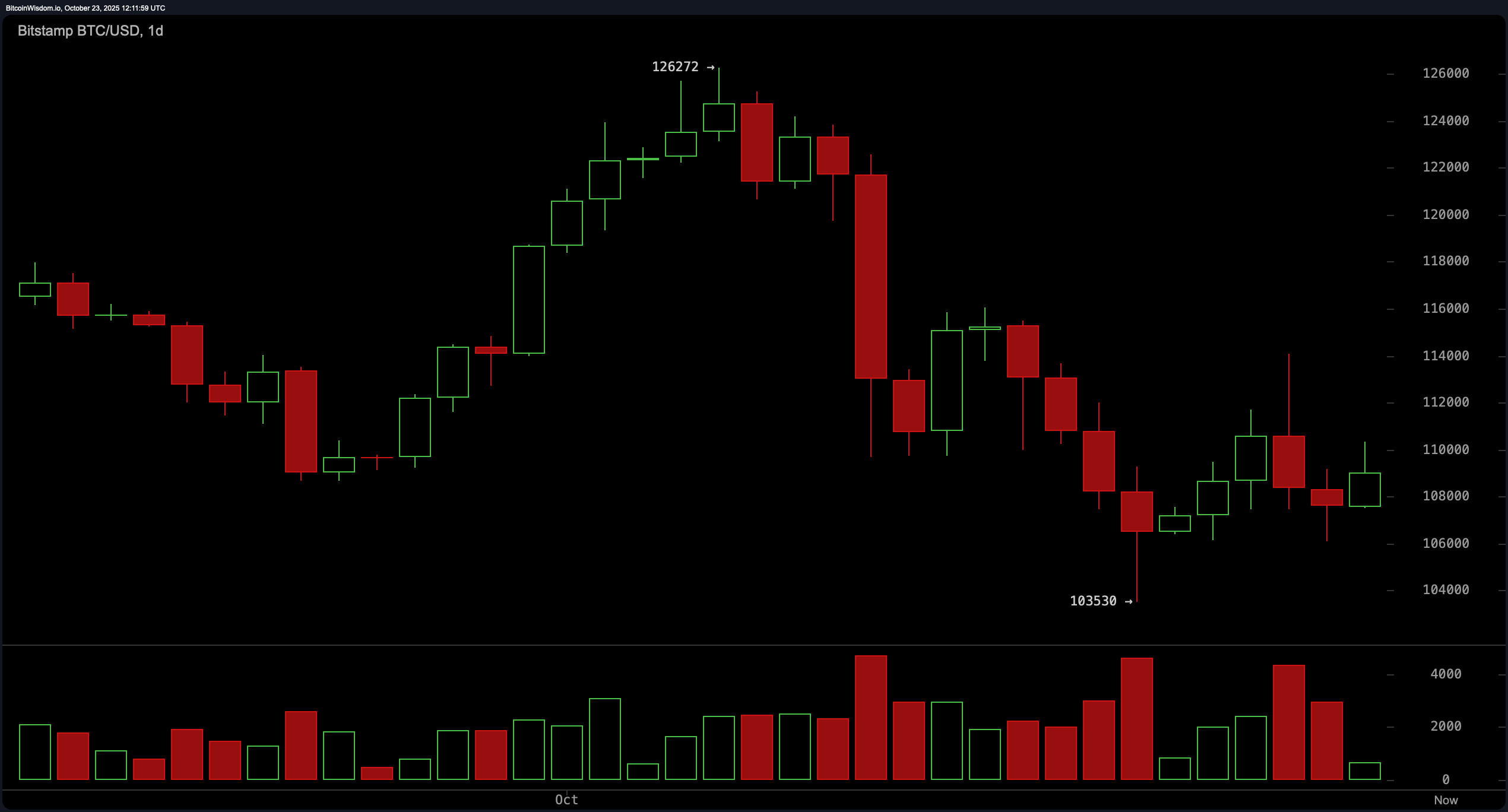 إذا كان للبيتكوين مزاج، اليوم سيكون “أنا أحاول، حسنًا؟” المخطط اليومي يروي قصة عملة تكافح لاستعادة مكانتها بعد تراجع حاد جعل المتداولين يمسكون بلوحات مفاتيحهم. بعد أن بلغت ذروتها عند 126,272 دولار، انخفض السعر بشدة إلى 103,530 دولار – وهي تضحية دراماتيكية مع ارتفاع في الحجم يوحي بالذعر.