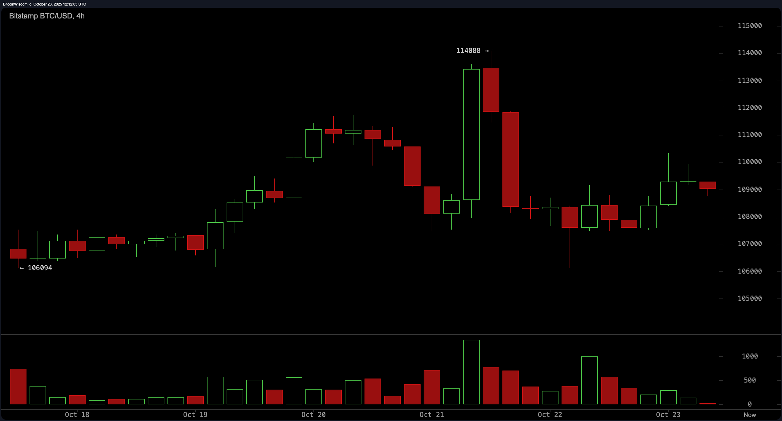 التكبير في مخطط الأربع ساعات يظهر شدّ وجذب بين الطموح والإرهاق. بعد ارتداد من قاع محلي عند 106,094 دولار وانطلاق إلى 114,088 دولار، فقد البيتكوين الزخم – وهي حركة فخ صعود كلاسيكي أو ضغط قصير ترك المتأخرين بلا شيء سوى الندم. السعر الآن يتحرك بشكل جانبي بين 108,000 دولار و110,000 دولار، مما يعكس مواجهة في الشعور العام. يحتاج الزخم إلى دفعة من الحجم إذا كانت هذه التجميعية ستتحرك للأعلى.