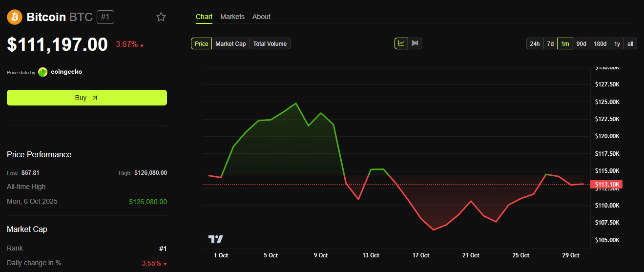 يحوم سعر بيتكوين حاليًا قرب $111 000, مع أحجام تداول ومعدلات تمويل العقود الآجلة أدنى بكثير مما كانت عليه في أوائل أكتوبر.