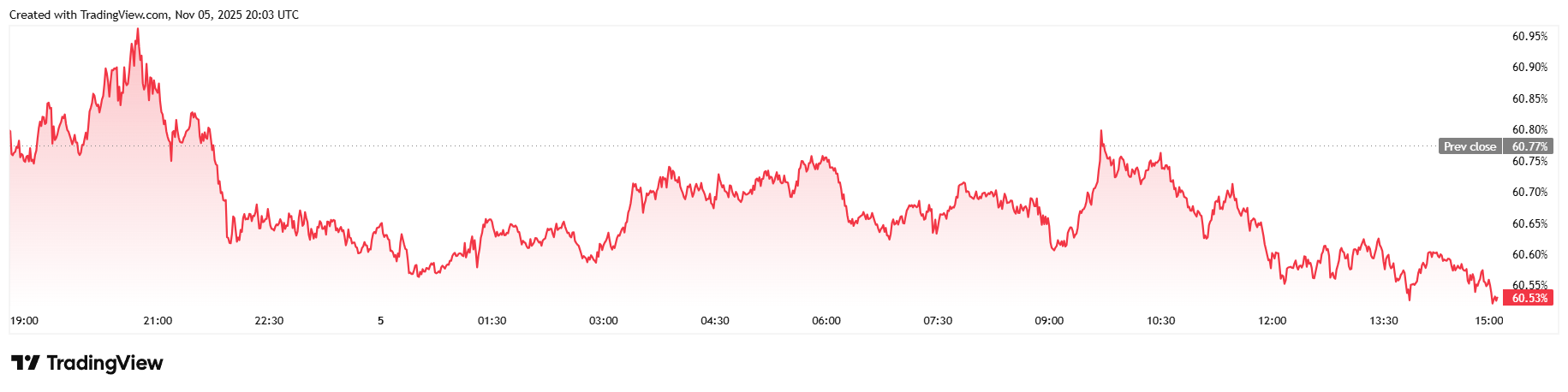 ظل حجم التداول على مدار 24 ساعة مستقرًا تقريباً عند حوالي 94 مليار دولار وارتفعت القيمة السوقية إلى 2.07 تريليون دولار. تراجعت هيمنة البتكوين قليلاً منذ أمس، حيث انخفضت بنسبة 0.43٪ إلى 60.53٪ وقت الإبلاغ.