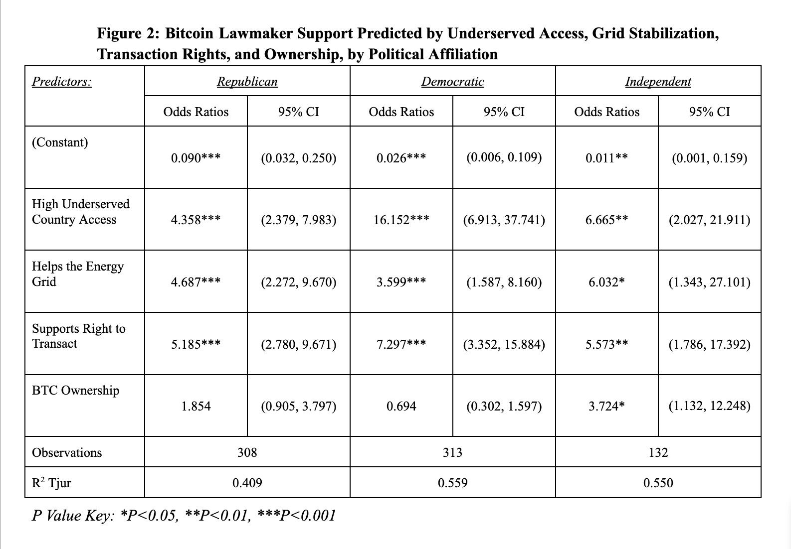 أخيرًا، يظهر المستقلون نمط استجابة مختلط. يرتبط دعمهم للمشرعين المؤيدين لبيتكوين بشكل وثيق مع التصور بأن بيتكوين يحسن الوصول للمجتمعات المحرومة (نسبة احتمالات 6,665)، يتبعها فوائد شبكة الطاقة (نسبة احتمالات 6,032) والحق في إجراء المعاملات (نسبة احتمالات 5,573).