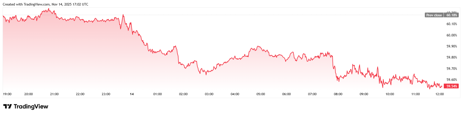 ارتفع حجم التداول اليومي إلى 128.86 مليار دولار، بزيادة 62.04%، مما يشير إلى بيع مكثف أكثر بكثير من الليلة الماضية. تراجعت القيمة السوقية إلى 1.93 تريليون دولار، وتراجع هيمنة البيتكوين 1.14% إلى 59.55%.