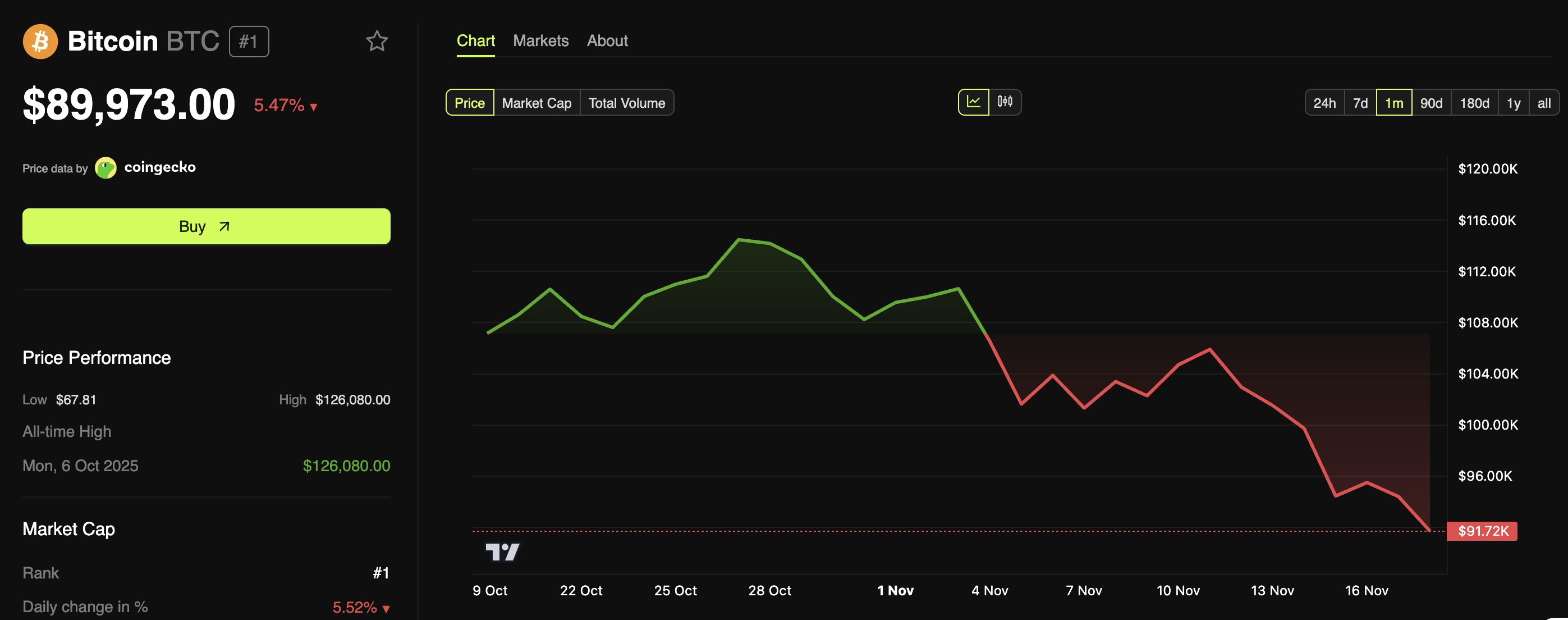 في وقت سابق اليوم، انخفض بيتكوين إلى ما دون ٩٠٬٠٠٠$، مما زاد من الانخفاض الذي استمر لأكثر من شهرين والذي أزال مكاسبه للعام ٢٠٢٤. الآن تقف العملة المشفرة الرائدة ٢٩% دون أعلى مستوى لها في تاريخها (ATH) في ٦ أكتوبر.