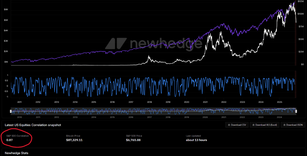 تظهر بيانات نيوهدج ارتباطاً بنسبة 0.87 مع S&P 500، ما يعني أن الاثنين يتحركان بشكل متوازٍ تقريباً. -