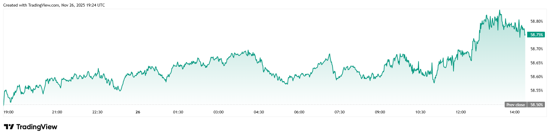 كان حجم التداول اليومي ثابتاً تقريباً عند 65 مليار دولار، وبلغت القيمة السوقية 1.79 تريليون دولار. ارتفع هيمنة البيتكوين مرة أخرى إلى 58.75%، وهي زيادة بنسبة 0.41%، حيث استعاد العملة الرقمية جزءاً صغيراً من حصة السوق من العملات الأقل.