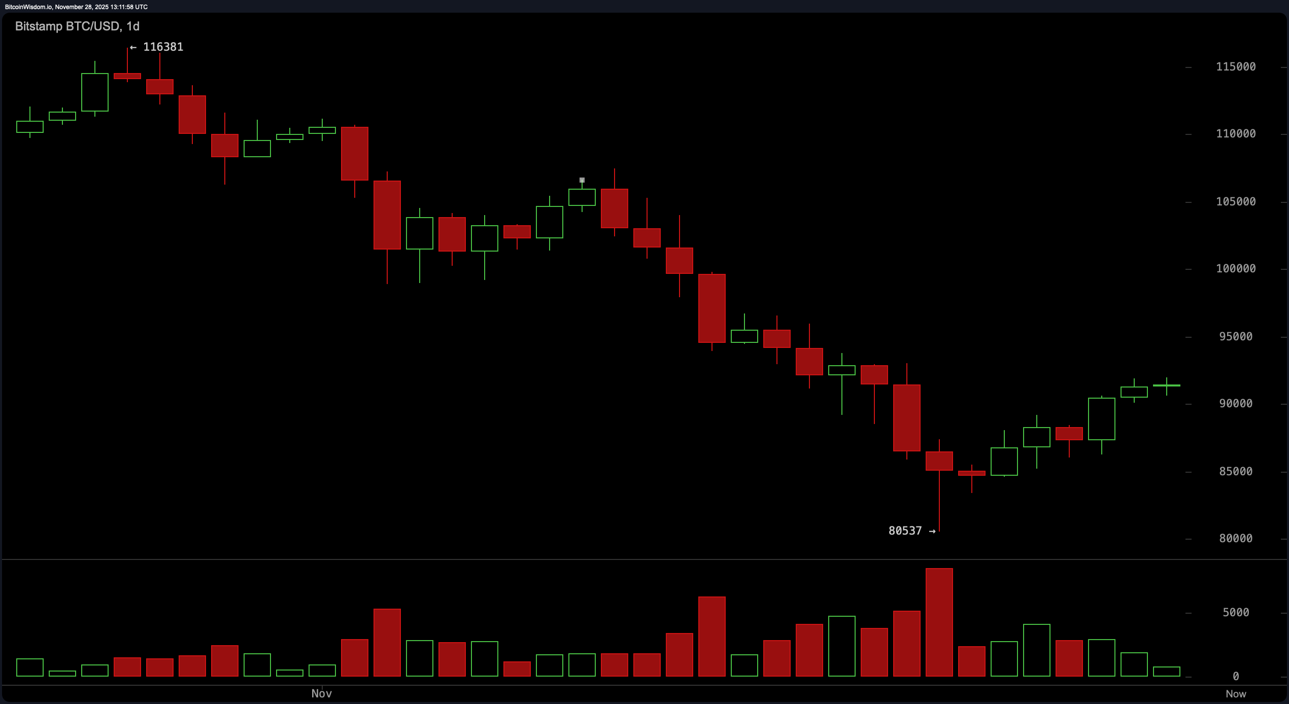 قبل الساعة 9 صباحًا بتوقيت شرق الولايات المتحدة، استقر سعر البيتكوين عند $91,463 إلى $91,809 في 28 نوفمبر 2025، مع قيمة سوقية تبلغ $1.826 تريليون وحجم تداول على مدار 24 ساعة يبلغ $52.72 مليار، متنقلًا بين نطاق يومي من $90,485 و $91,839. في حين أن حركة السعر تقترب من المقاومة، تشير الرسوم البيانية إلى أن هذا ليس فقط استراحة – إنه نقطة انطلاق محتملة.