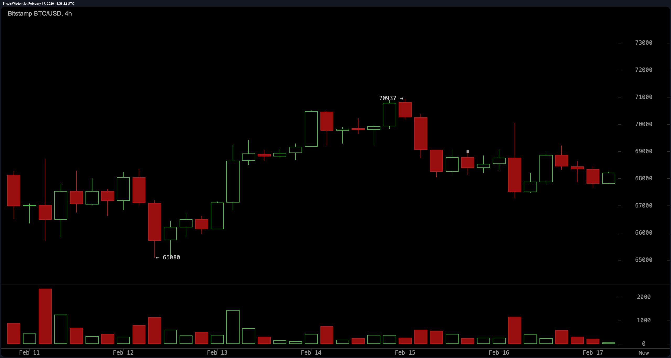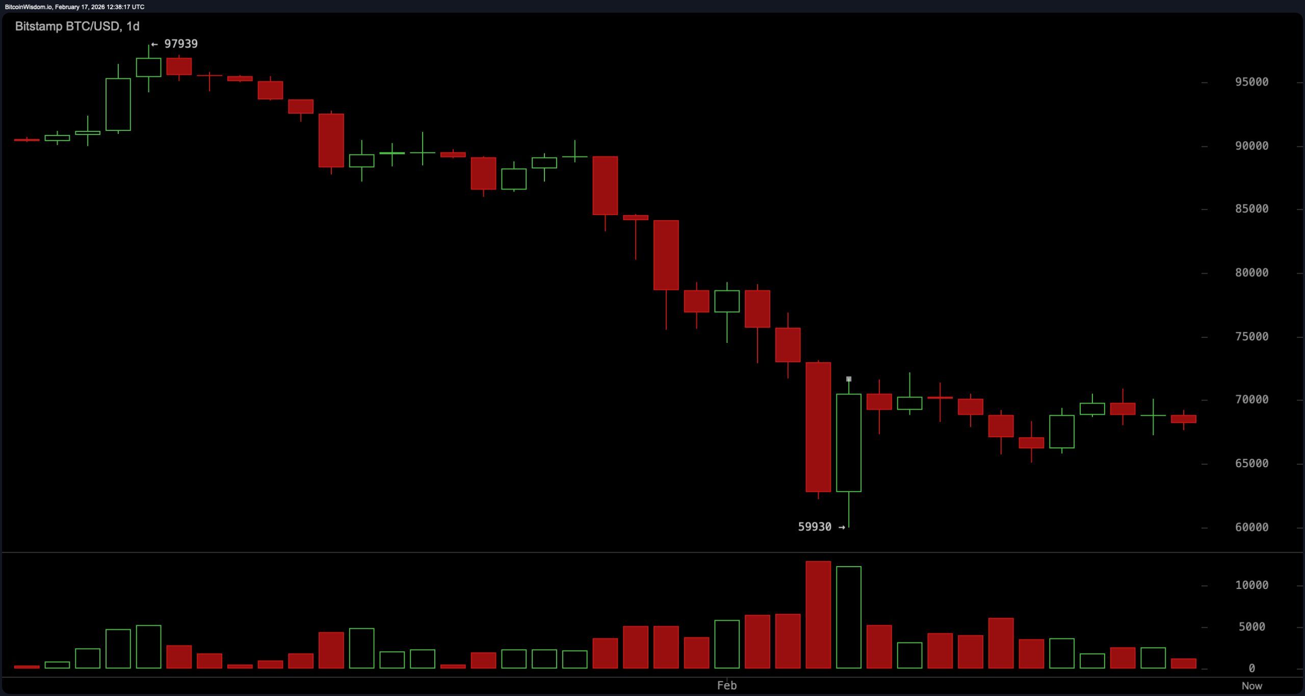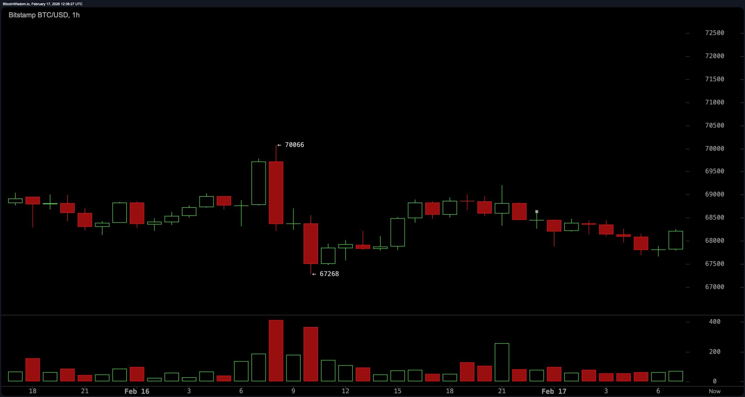 عاد بيتكوين إلى وضع الانضغاط في 17 فبراير 2026، حيث يتم تداوله عند 68,021 دولارًا بعد اختبار نطاق يومي بين 67,381 و69,999 دولارًا. ومع حجم تداول خلال 24 ساعة بلغ 36.58 مليار دولار وقيمة سوقية قدرها 1.37 تريليون دولار، فهذا ليس شريطًا هادئًا — بل سوق يتوقف، ويعيد المعايرة، ويتحدى المتداولين لردّ فعل مبالغ فيه.