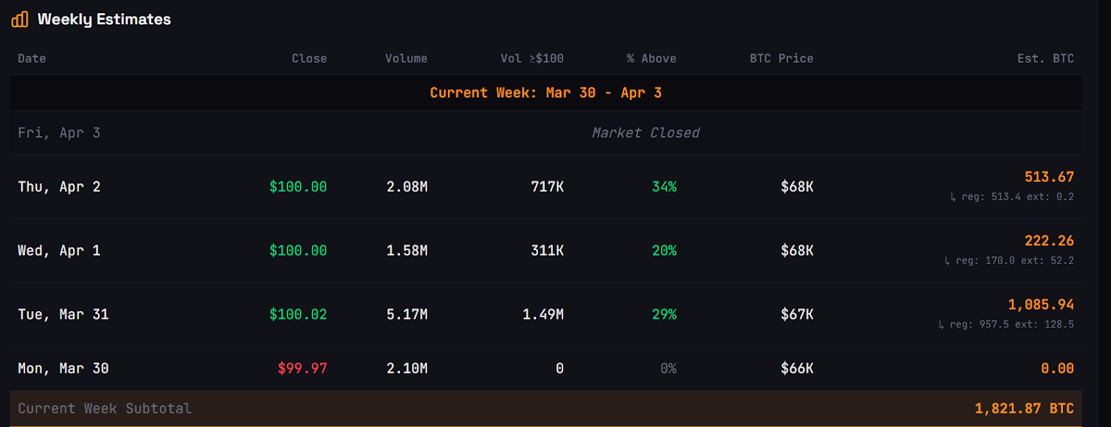 ووفقاً لتقديرات منصة STRC.LIVE، قد تكون الشركة بصدد شراء ما لا يقل عن 1,821 $BTC، بناءً على الأموال التي جُمعت للأسبوع المنتهي في 3 أبريل.