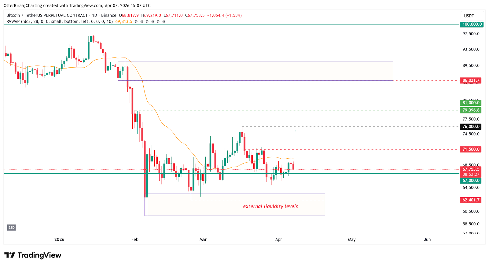 وعلى الرسم البياني اليومي، أغلق $BTC دون مستوى 67,000 دولار في 26% من أيام التداول (16 يومًا من أصل 61) منذ 5 فبراير، عندما انخفض لأول مرة دون هذا المستوى منذ أكتوبر 2024.