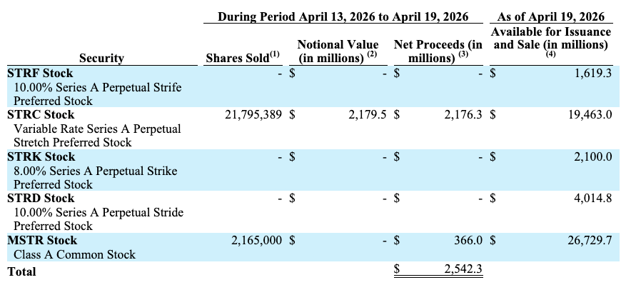 ووفقًا للإفصاح، وفّرت STRC نحو 2.18 مليار دولار، أي ما يعادل 85.7% من إجمالي العائدات، بينما ساهمت مبيعات الأسهم العادية من الفئة A (MSTR) بمبلغ 366 مليون دولار.