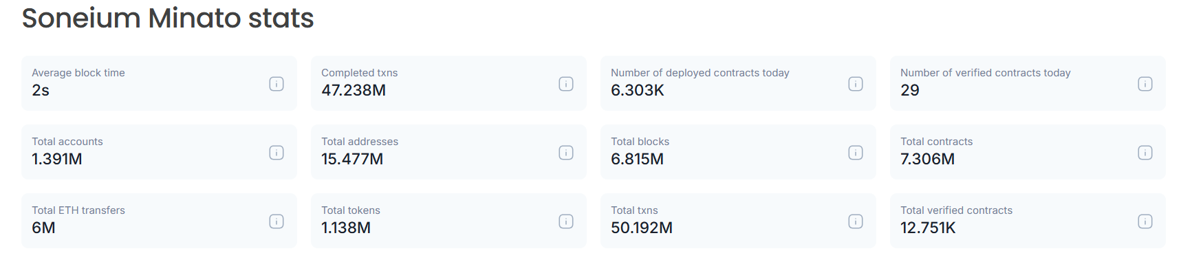 وفقًا لبيانات بلوكسكوت، تحتوي بلوكشين سونيوم الآن على 6,8 مليون كتلة إجمالية ومتوسط وقت الكتلة 2 ثانية. بلغ إجمالي العقود على المنصة 7,3 مليون.